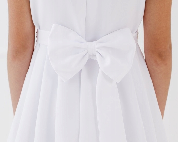 Простое, элегантное платье с вырезом на талии и изящными складками внизу. Сзади красивый готовый бант. Регулируемый пояс с бантом позволяет точно подогнать платье по талии.