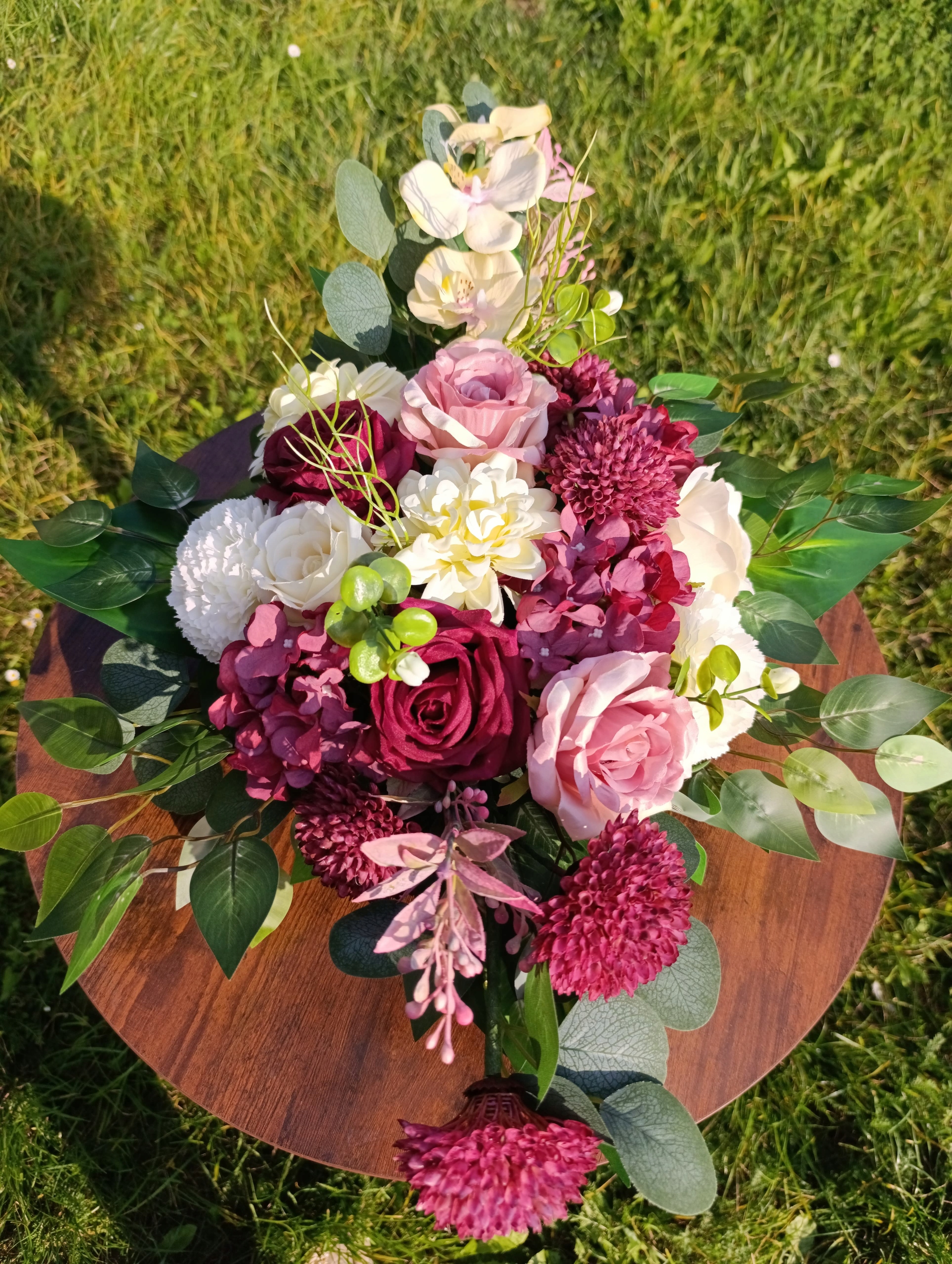 Букет, предназначенный для надгробия в тонах бордового, белого и розового.