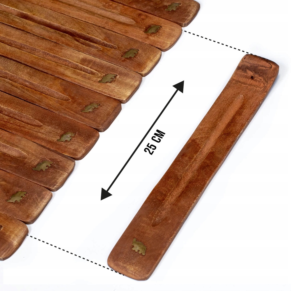 Подставка для ароматических палочек изготовлена вручную из очень твердой, прочной древесины, устойчивой к высоким температурам. Он оснащен небольшим отверстием, в которое помещаются благовония, и носиком, в который падает пепел от сгоревшей палочки. Подставка украшена латунным слоном.