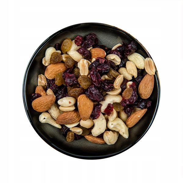 • содержит 5 ингредиентов — жареный арахис, изюм, клюкву, кешью и миндаль,