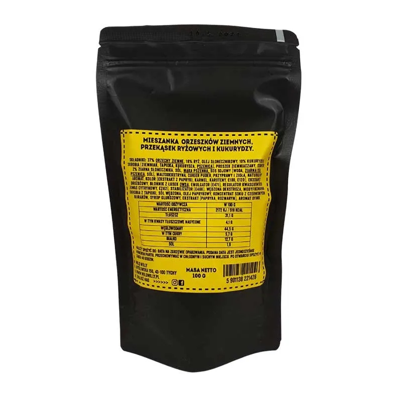 <р> Производство польской компании Wild Willy, закусочная смесь в упаковке 100 г. <р> Закуска, состоящая в основном из арахиса, рисовых крекеров и жареной кукурузы. Очень вкусная, хрустящая закуска, которую оценит каждый гурман. Такое сочетание ингредиентов гарантирует очень интересное сочетание вкусов и текстов. Идеально подобранные специи прекрасно дополняют целое, придавая нужное послевкусие и глубину аромата. <р> Закуска идеальна к хорошему крафтовому пиву, киновечерам, встречам с близкими или даже пикнику. Все это упаковано в пакет на молнии, на случай, если мы как-нибудь не поддаемся искушению все пережевать. Благодаря такому решению закуска не обветривается и не теряет вкуса и запаха. <р> Состав:37 % арахис, рис 18 %, подсолнечное масло, кукуруза 10 %, крахмал (картофельный, тапиоковый, кукурузный, пшеничный), картофельный порошок, сахар 2 %. семена подсолнечника, соль, мука пшеничная, соус соевый (вода, соевые бобы, пшеница, соль), мальтодекстрин, сахарная пудра, специи и травы, натуральный ароматизатор, краситель (экстракт паприки, карамель, каротины, Е100, Е120), дрожжевой экстракт, овес клетчатка лузги, эмульгатор (Е471), регулятор кислотности (лимонная кислота, Е262), стабилизатор (Е466), декстроза копченая, модифицированный крахмал тапиоки, соль копченая, масло паприки, концентрат сока красной свеклы, глюкозный сироп, экстракт (паприка, розмарин), аромат дыма