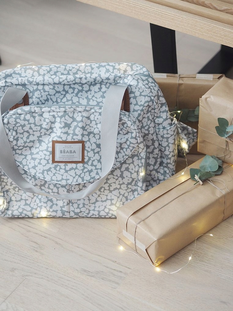 Чрезвычайно функциональная и дизайнерская сумка для мам от французского бренда BEABA. В него можно легко поместить необходимые детские аксессуары и удобно их организовать. Сумка светло-серого цвета с белым цветочным узором, темно-серыми молниями и деталями из кожи карамельного цвета, имеет элегантный дизайн.