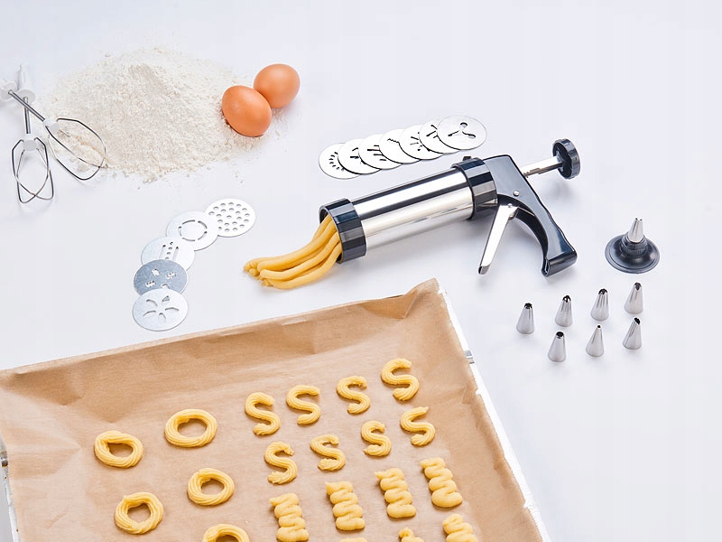 Профессиональный кухонный декоратор, идеально подходящий для выпечки печенья, кексов и пряников, придания им интересных форм — 13 шаблонов на выбор от . Более того, благодаря 8 различным советам вы легко сможете украсить небольшую выпечку или создать торт своей мечты. Помимо сладостей, кондитерский мешок можно использовать для украшения пикантных блюд и холодных закусок, например, горчицей, майонезом или другим густым кремом собственного приготовления. Твердый кондитерский мешок и насадки изготовлены из нержавеющей стали, а шаблоны — из алюминия, и все это удобно сложено в пластиковую коробку с прозрачной крышкой.