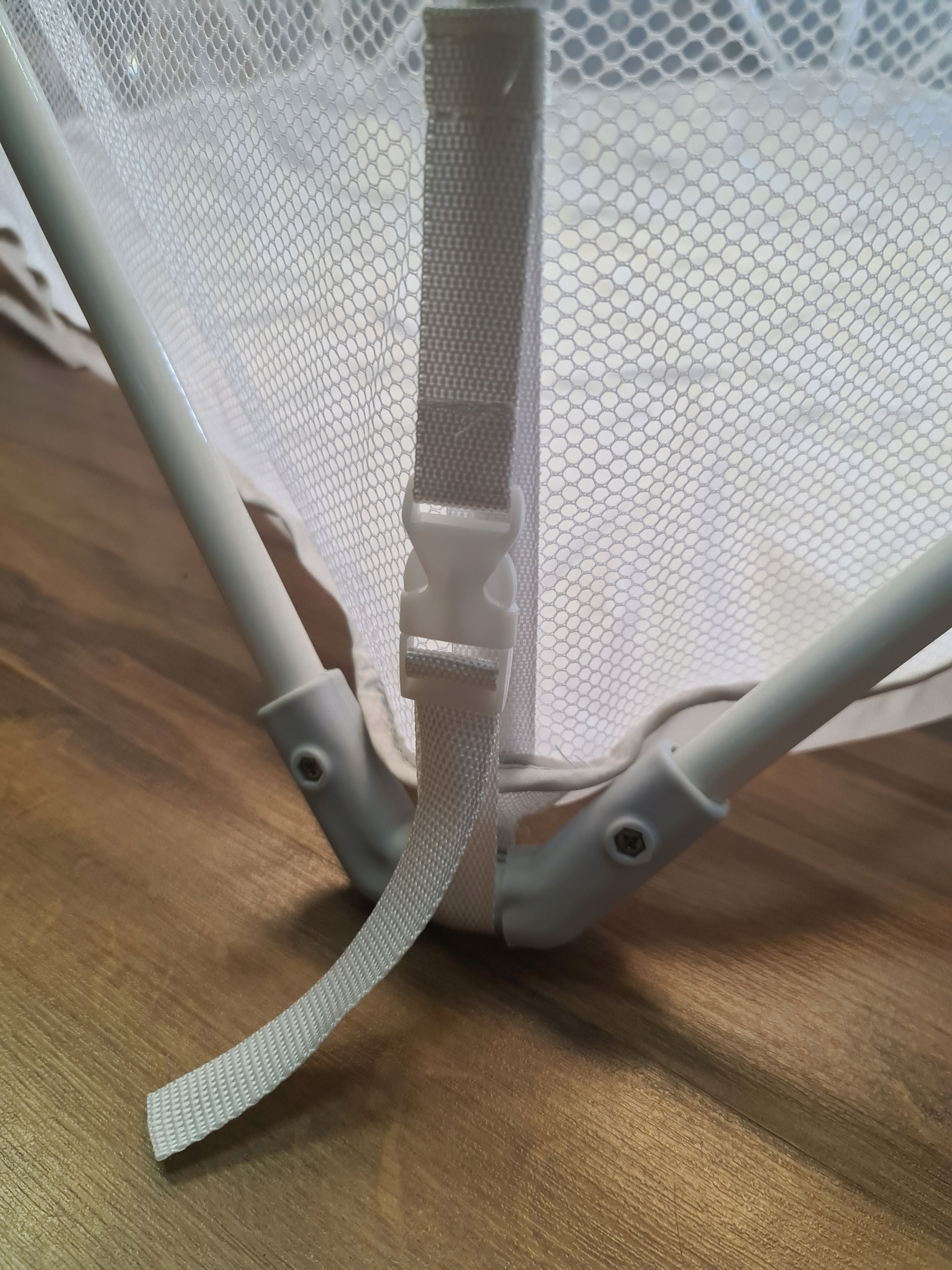 - Разворачиваем манеж движением руки, в следующим шагом используем натяжители и пристегиваем нижние напольные пряжки и готово - все просто!