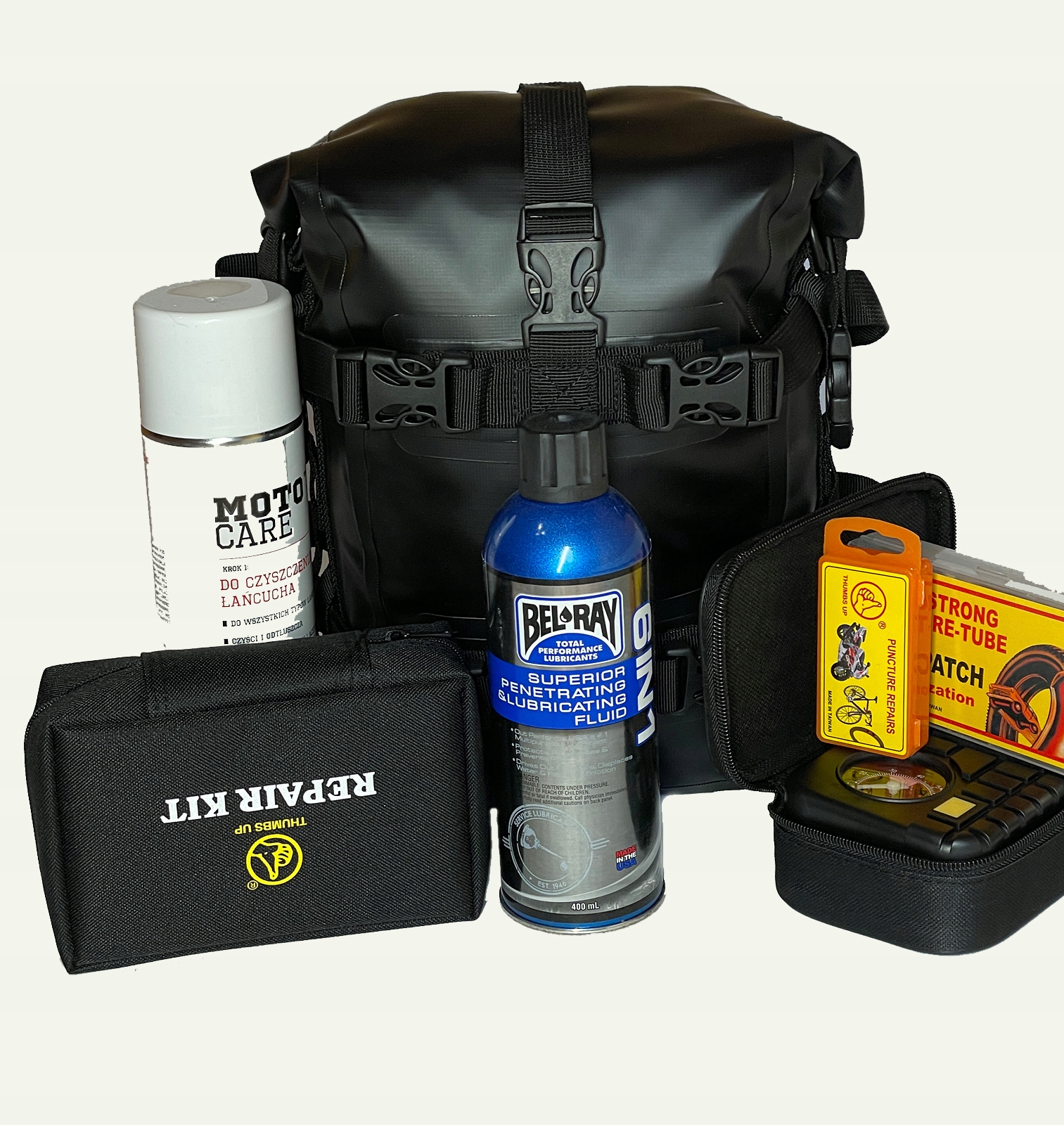 Вместимость мешка подобрана так, чтобы т.н. «В воскресную поездку» возьмите с собой необходимое снаряжение: две камеры, ложки, компрессор, смазку для цепи, сцепление и трос газа.