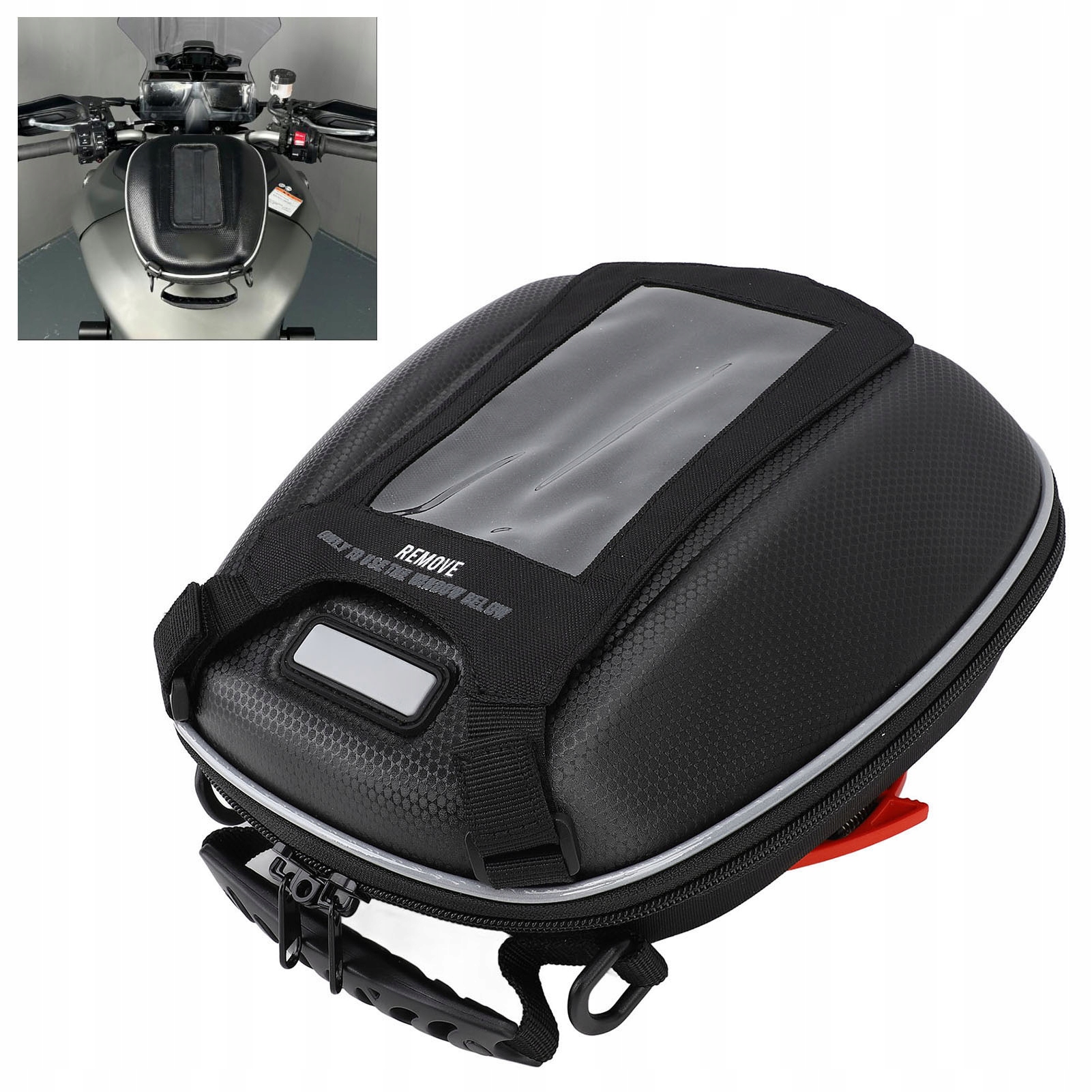 3. Прозрачный верх: прозрачное окно сверху идеально подходит для удобного доступа к мобильным телефонам и навигационным системам, водонепроницаемые молнии и дождевик обеспечивают дополнительную защиту ваших вещей.