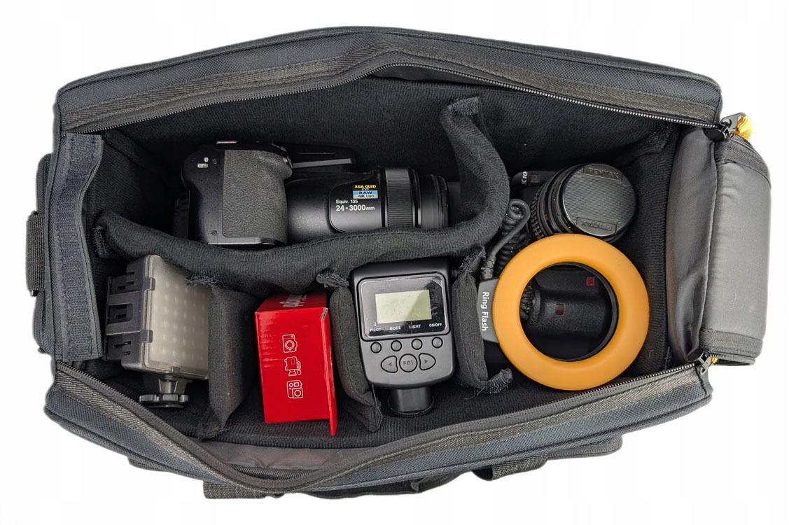 В сумке можно разместить большую камеру с аксессуарами, такими как: