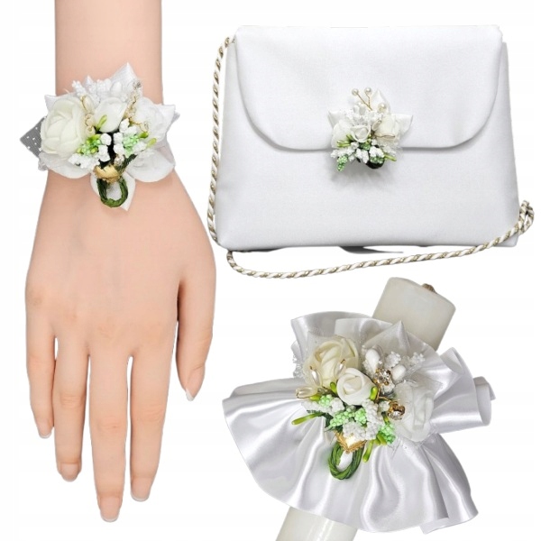 Круглая сумка из первоклассного полуматового свадебного атласа. С ручкой из витой бело-золотой веревки длиной примерно 26 см. Украшена декором из пенопластовых роз с зеленым акцентом и бусинами на золотой проволоке.