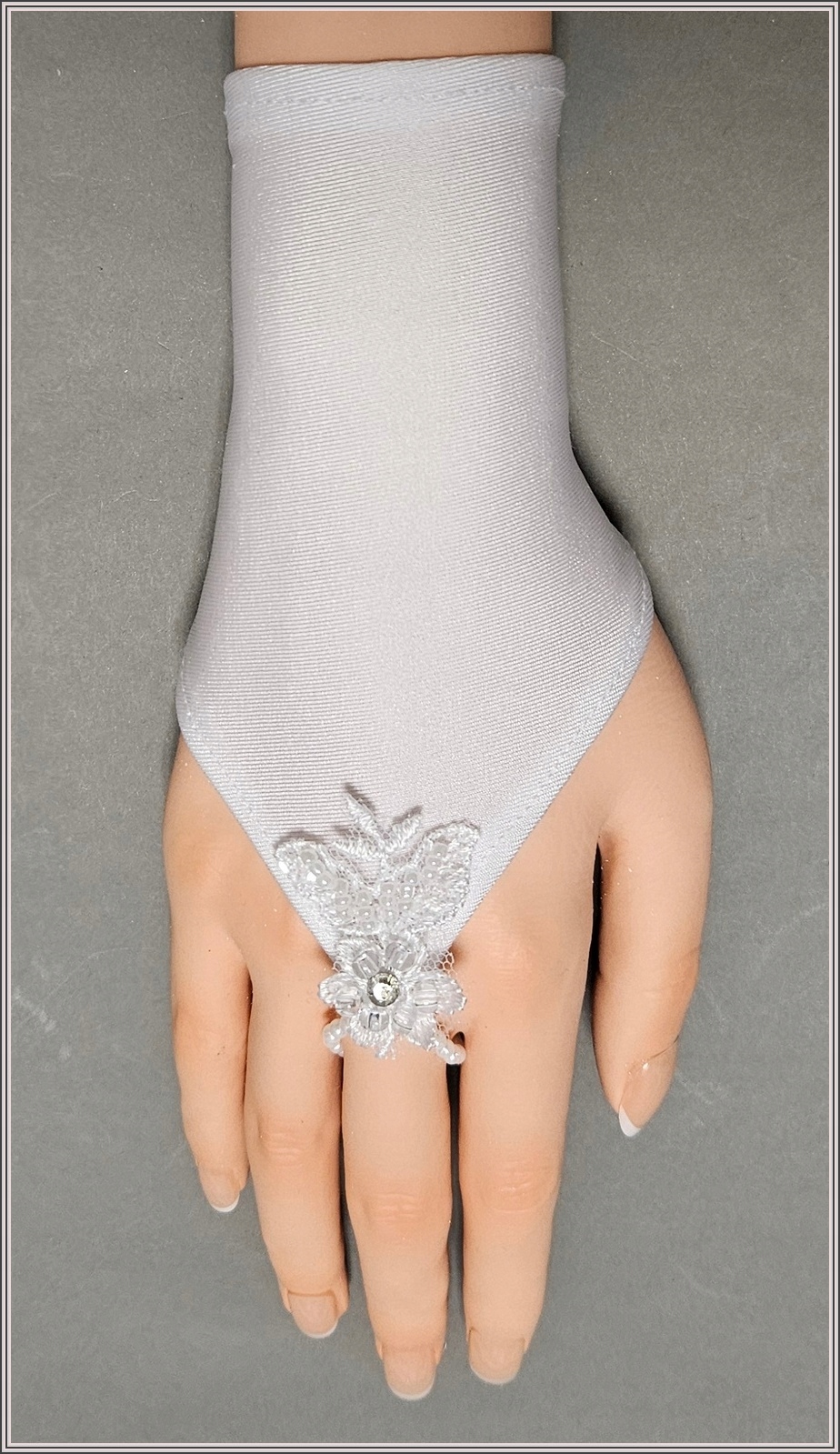 Белые эластичные перчатки для причастия для девочек. Надевается на один палец. Украшен небольшой кружевной аппликацией, отделанной бисером и жемчугом.