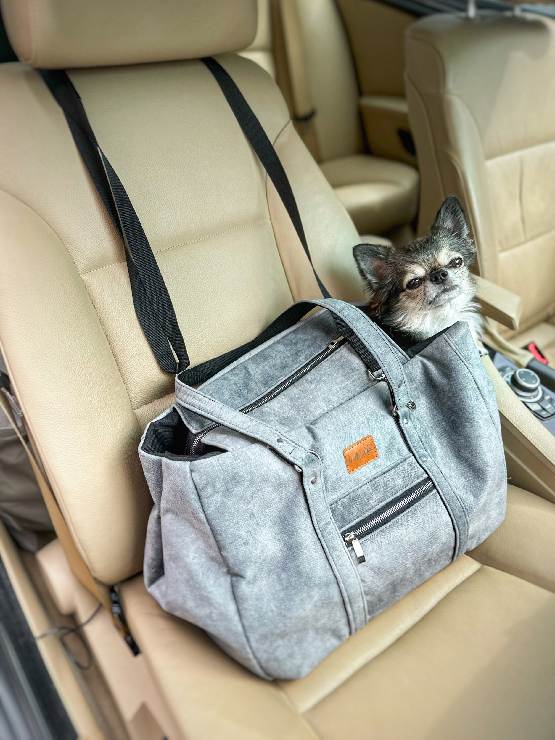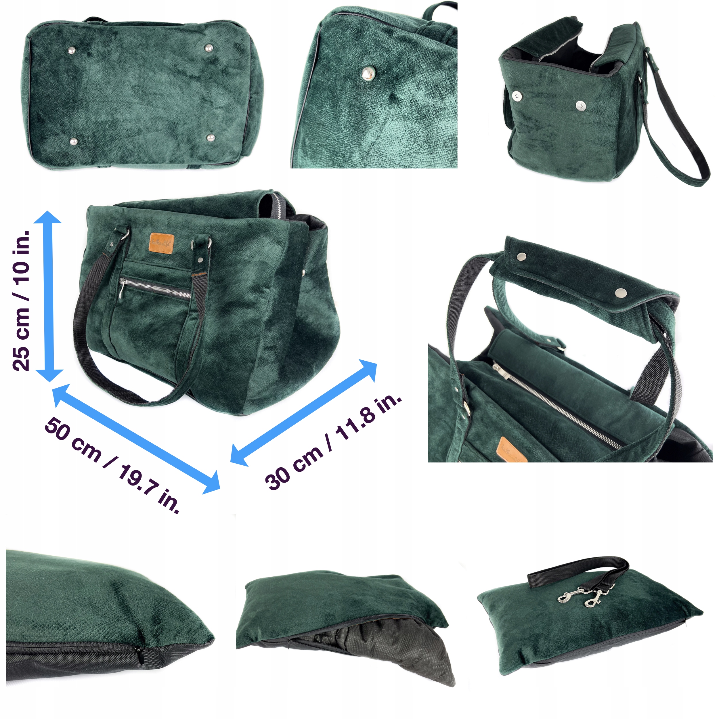 Наши сумки для перевозки собак изготовлены из толстого, прочного велюрового материала, дружелюбного к домашним животным. Материал устойчив к загрязнениям и намоканию. Сумка имеет жесткое дно, а внутри также находится съемная мягкая подушка, с которой наволочку можно в любой момент снять и постирать. В комплект поставки сумки также входит дополнительный ремень, позволяющий прикрепить сумку к автомобилю с помощью подголовника. Благодаря ремню мы также можем с комфортом носить сумку на плече. Сумка также оснащена съемной удобной ручкой. Собаку можно прикрепить к сумке с помощью прилагаемого карабина. Также сумка имеет внешний карман. Наша дорожная сумка для собак идеальна для прогулок, в машине, поезде или самолете.