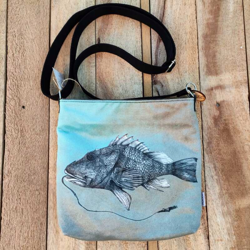Velor listanoska Сумочка с размерами около 30x30 см с рисунком с изображением рыбы на серо-туркурированном фоне! Распечатка рисунка сделана на велюре, очень прочном методе сублимации, который гарантирует длительный срок службы сумки. Ремень изготовлен из сильной хлопчатобумажной ленты в черном.