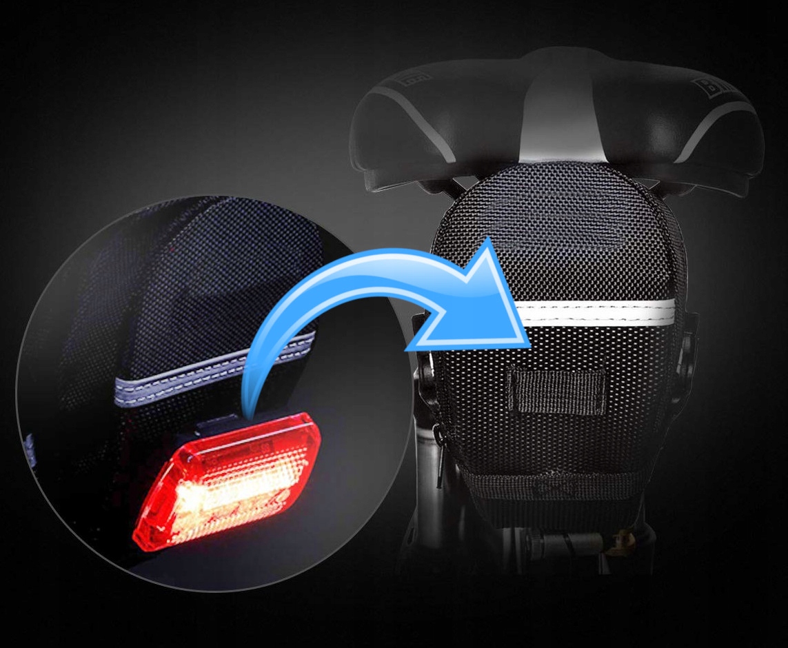 Сзади седельной сумки вшит специальный ремень. Позволяет прикрепить к нему задний велосипедный фонарь, который обычно крепится к подседельному штырю велосипеда.