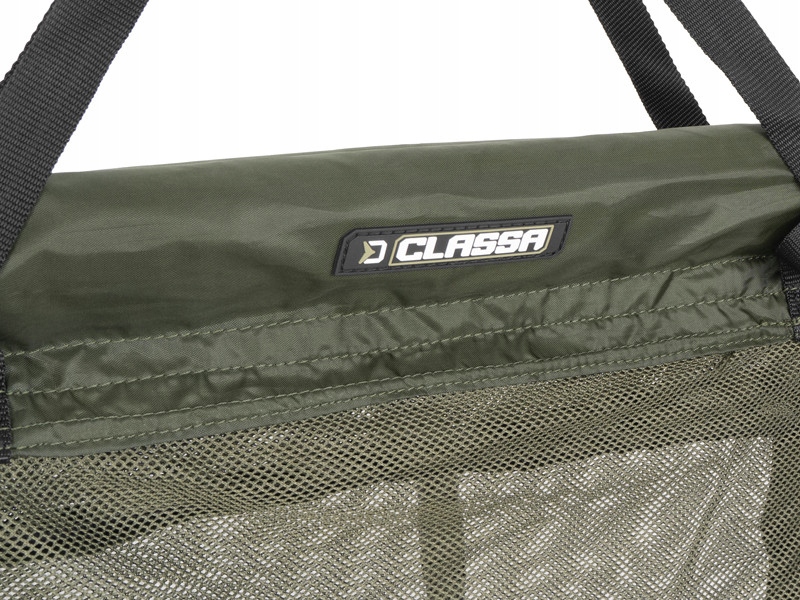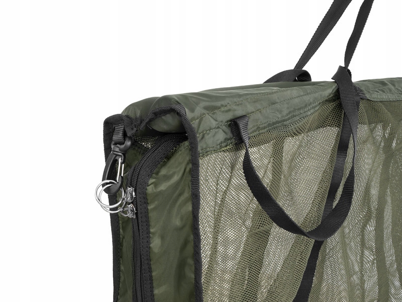 Сетка усилена двумя черными текстильными полосами, которые доходят до центральной ручки. Благодаря длинным ручкам сумку можно легко повесить на весы. Сумка также имеет текстильные ручки с обеих сторон для удобства подъема и переноски. С обеих сторон и сверху расположена прочная молния, позволяющая полностью расстегнуть CWS для более удобной транспортировки рыбы.