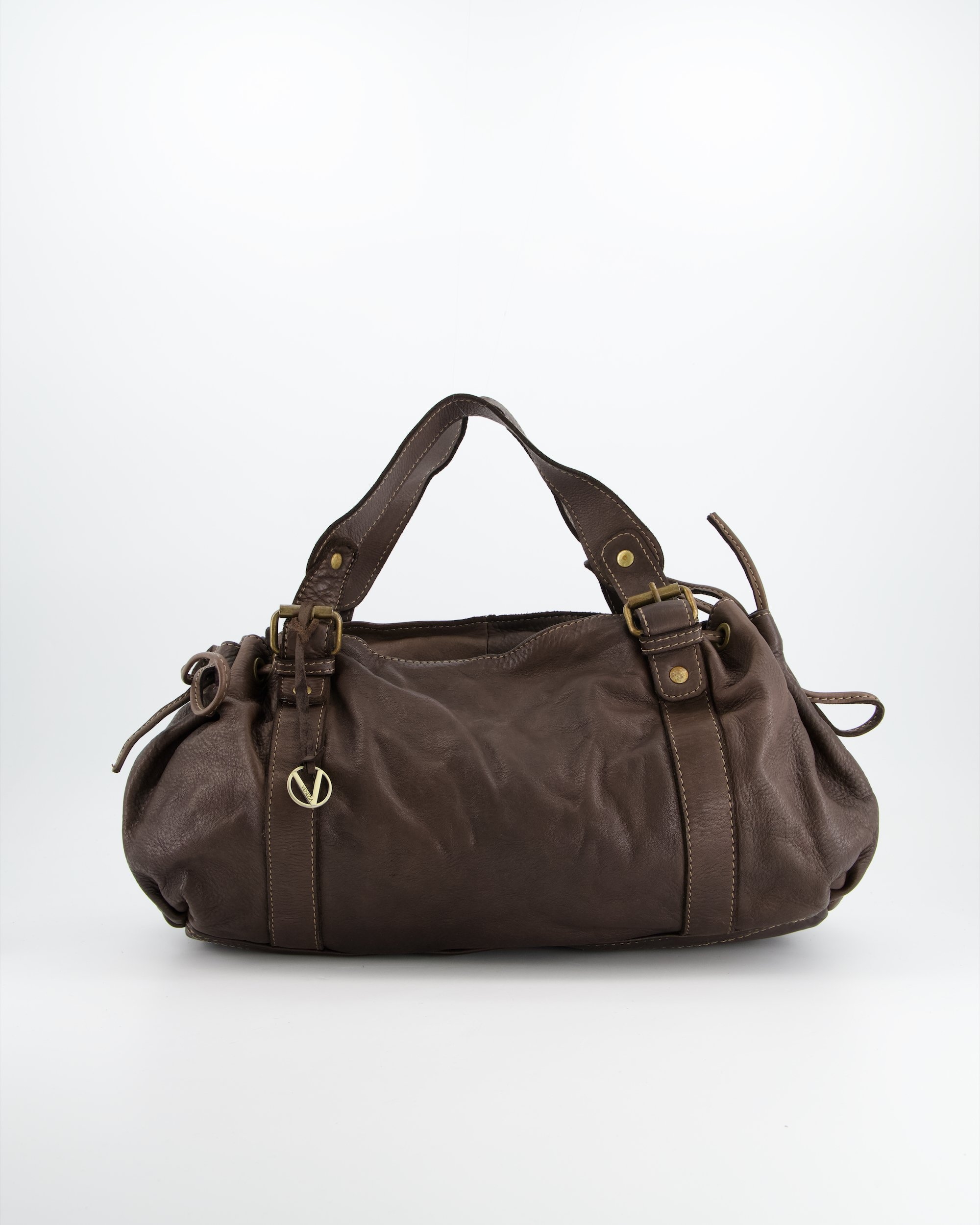 <р> Женская темно-коричневая дорожная сумка из натуральной кожи со слегка мятой фактурой. Продолговатая форма с двумя короткими ручками дополнена завязками по бокам, которые придают всей вещи мягкий, повседневный вид. Золотая фурнитура и декоративная строчка подчеркивают элегантный характер модели. Сумка оснащена съемным регулируемым ремнем, позволяющим носить ее на плече. Внутри три практичных кармана помогут держать вещи в порядке и удобно хранить мелкие предметы.- натуральная кожа