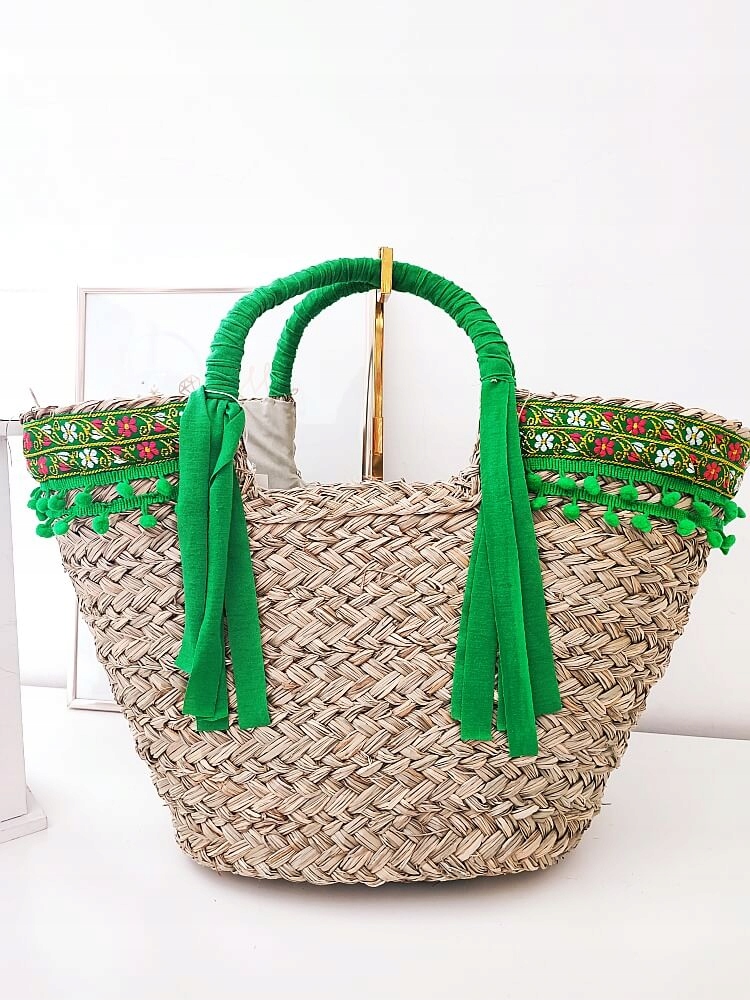 Сумка-корзина макси с вышивкой, бежевый и зеленый