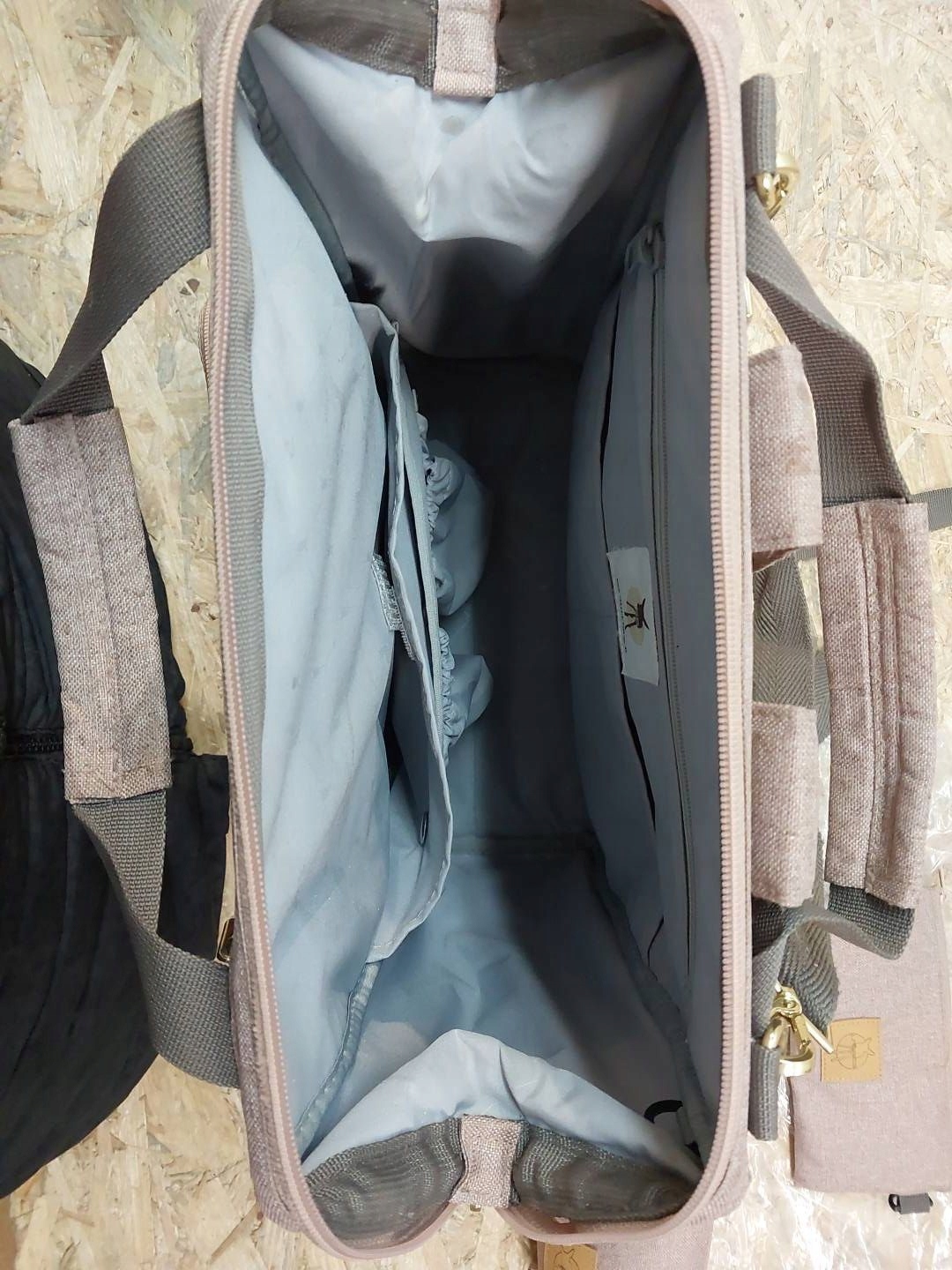 многочисленные внутренние карманы, позволяющие хорошо организовать пространство, в том числе: больший водонепроницаемый на молнии (для мокрой одежды или подгузника), два открытых поменьше, один побольше на липучке - предназначен для пеленального столика , и два поменьше, отделанные резинкой – идеально подходят для баночек с обедом или напитком, крепятся на кнопках, которые при необходимости можно отстегнуть; внутри — идеальное место для салфеток или нагрудников