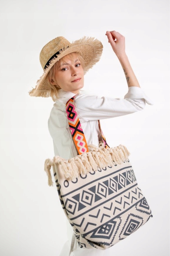 Большая тканевая сумка с ацтекскими узорами, отделанная бахромой.