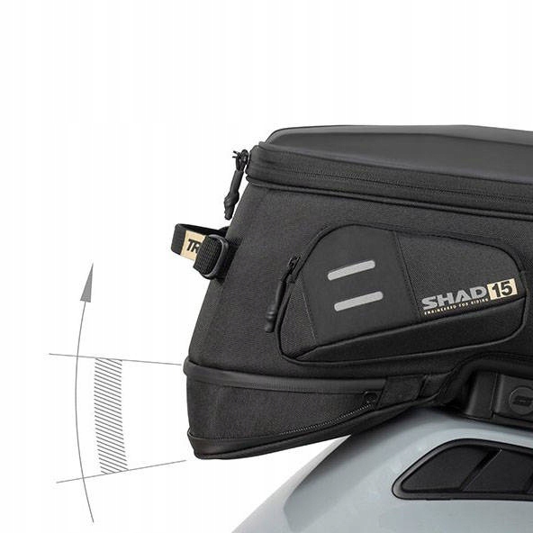 Молнии имеют удобные ручки, позволяющие работать в перчатках. Дно сумки имеет регулируемый клапан, позволяющий подогнать форму сумки под профиль топливного бака. Крепление Click System можно установить в одно из двух положений, размещая сумку ближе к передней или задней части, в зависимости от конфигурации мотоцикла и положения водителя. Для сумки требуется крепление Click System для данной модели мотоцикла, которое продается отдельно. Объём сумки: 13 литров. Сумка на бак TR15 дополняет серию мягкого багажа SHAD Terra, образуя комплект из боковых кофров TR40 и заднего багажника TR50. Сумка на бак серии Click System крепится с помощью переходника на топливную заправочную горловину. Он позволяет быстро пристегивать и отстегивать сумку с помощью кнопки. Версии, отмеченные символом CL, оснащены замком, предотвращающим расстегивание сумки.