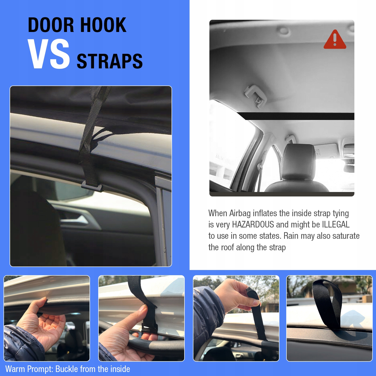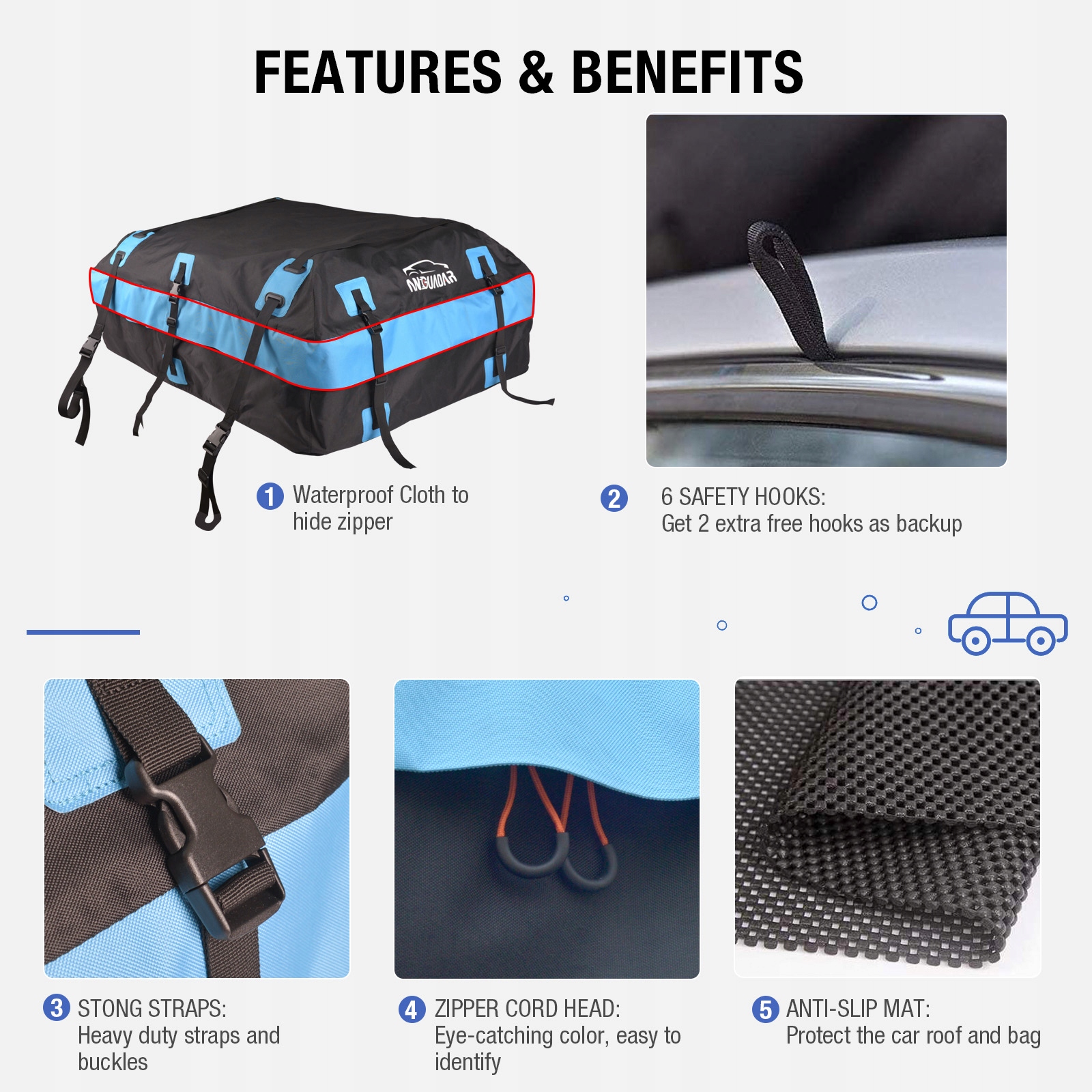 🚙 Простота в использовании: оснащена восемью прочными ремнями быстрого натяжения. и 6-дверные крючки, которые легко установить и которые можно использовать независимо от того, есть ли в вашем автомобиле багажник на крыше или нет. Благодаря противоскользящим накладкам багаж можно зафиксировать на месте, не поцарапав автомобиль.