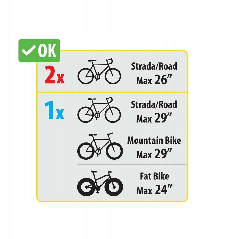 - Максимальная вместимость: 2 опорных катка по 26 дюймов или 1 колесо по 29 дюймов или 1 толстое колесо по 24 дюйма или 1 колесо по 24 дюйма. 29-дюймовое MTB-колесо