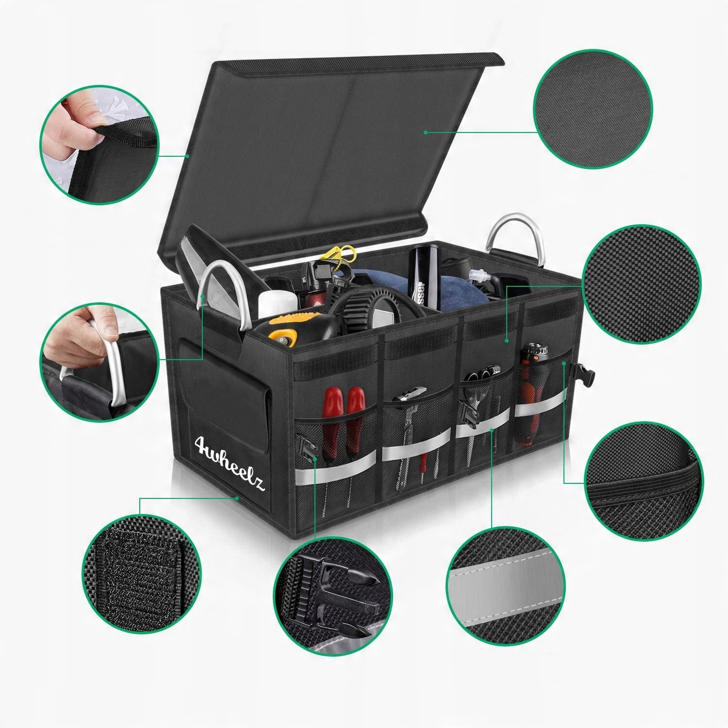 Verden — идеальный автомобильный органайзер, обеспечивающий порядок в каждом багажнике. Продуманная конструкция позволяет использовать его в соответствии с вашими потребностями. Мы можем использовать органайзер целиком, можем разделить его на части или уменьшить вдвое. Он изготовлен из материалов высочайшего качества с вниманием к каждой детали. Благодаря материалу OXFORD 1680D он обладает повышенной прочностью и устойчивостью к повреждениям и является водонепроницаемым. Автомобильная сумка имеет прочные алюминиевые ручки, крышку на липучке, прочную строчку и липучку в нижней части основания, поэтому ее можно прикрепить к пол багажника. Помимо вместительных внутренних отделений, Verden имеет внешние сетчатые карманы и большой боковой карман на липучке. Кроме того, в целях безопасности сумка оснащена отражателями. Модель после упаковки принимает форму небольшого чемодана и занимает очень мало места.