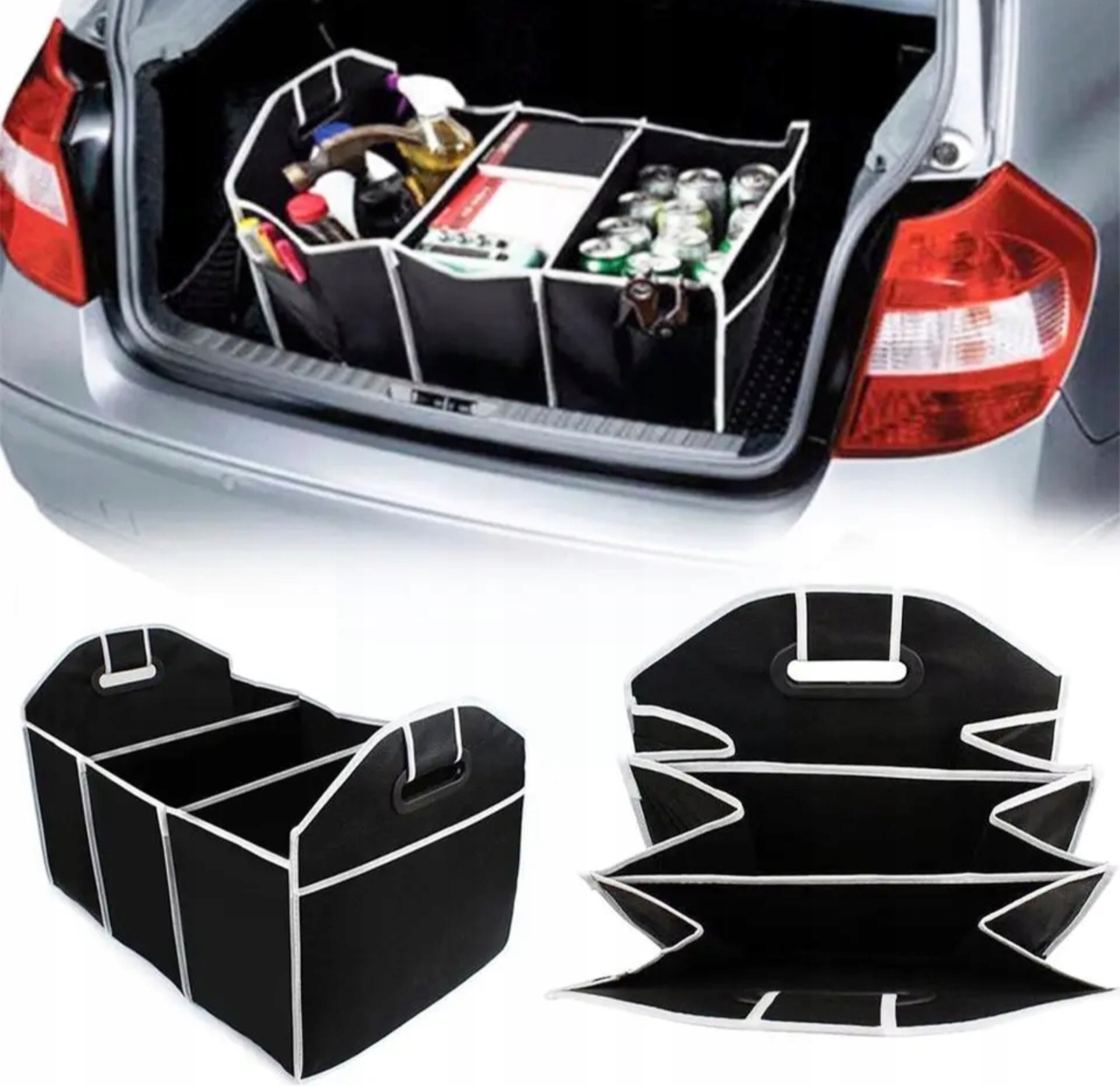 Прочный складной органайзер в багажник, разделенный на три больших отделения с удобными усиленными ручками для переноски, расположенными по коротким сторонам.