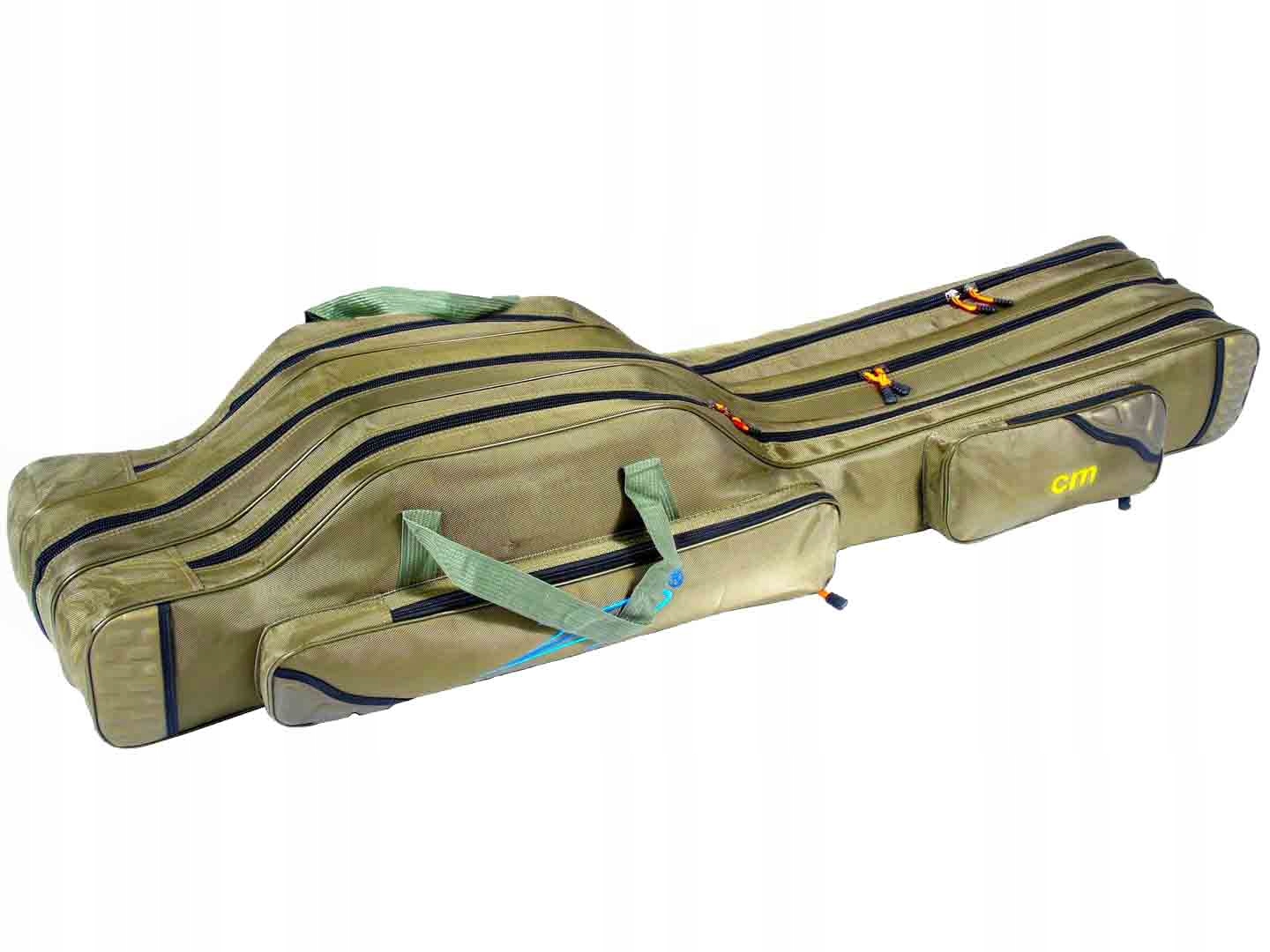 Чехол изготовлен из прочного материала, устойчивого к истиранию, разрывам и погодным условиям. Кроме того, он прорезинен. Имеет три отделения для удочек с катушками. Он также оснащен 2 боковыми карманами для других рыболовных принадлежностей. Удобный ремень для ношения на плече и уши для удержания в руке.