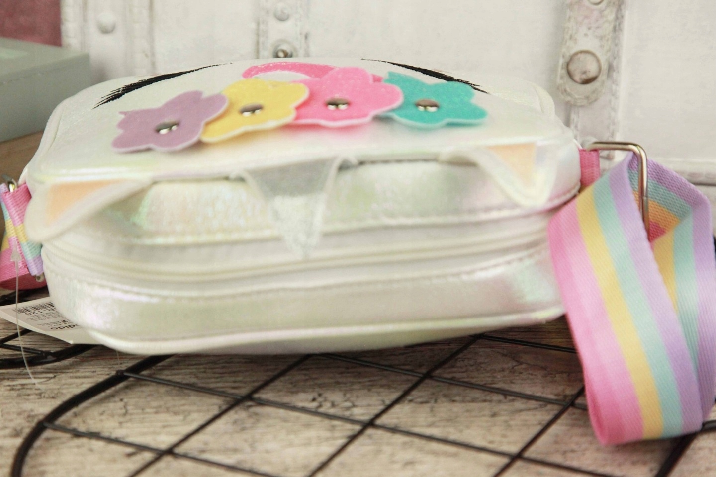 Имеет одно отделение и радужный регулируемый ремешок.