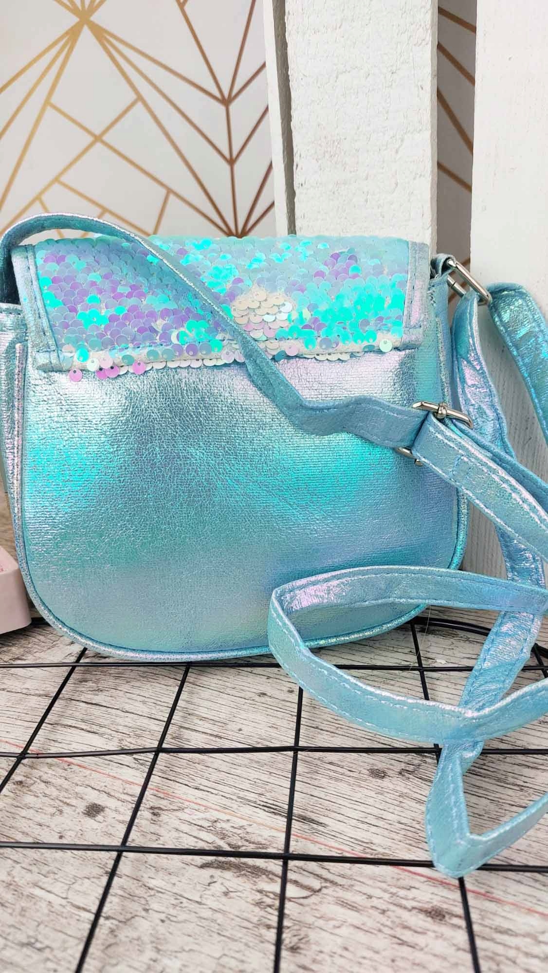 Клапан сумки расшит красиво мерцающими пайетками. Дополнительно очарования добавляет удивительное сердечко с крылышками. Сердце красиво сверкает, а крылышки выполнены из голографического материала.