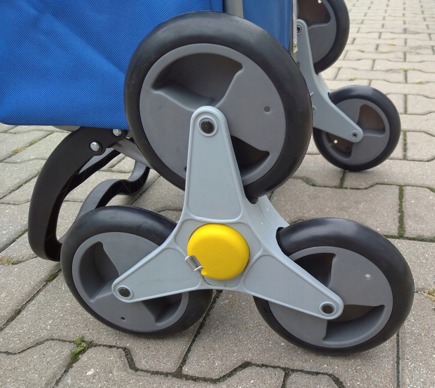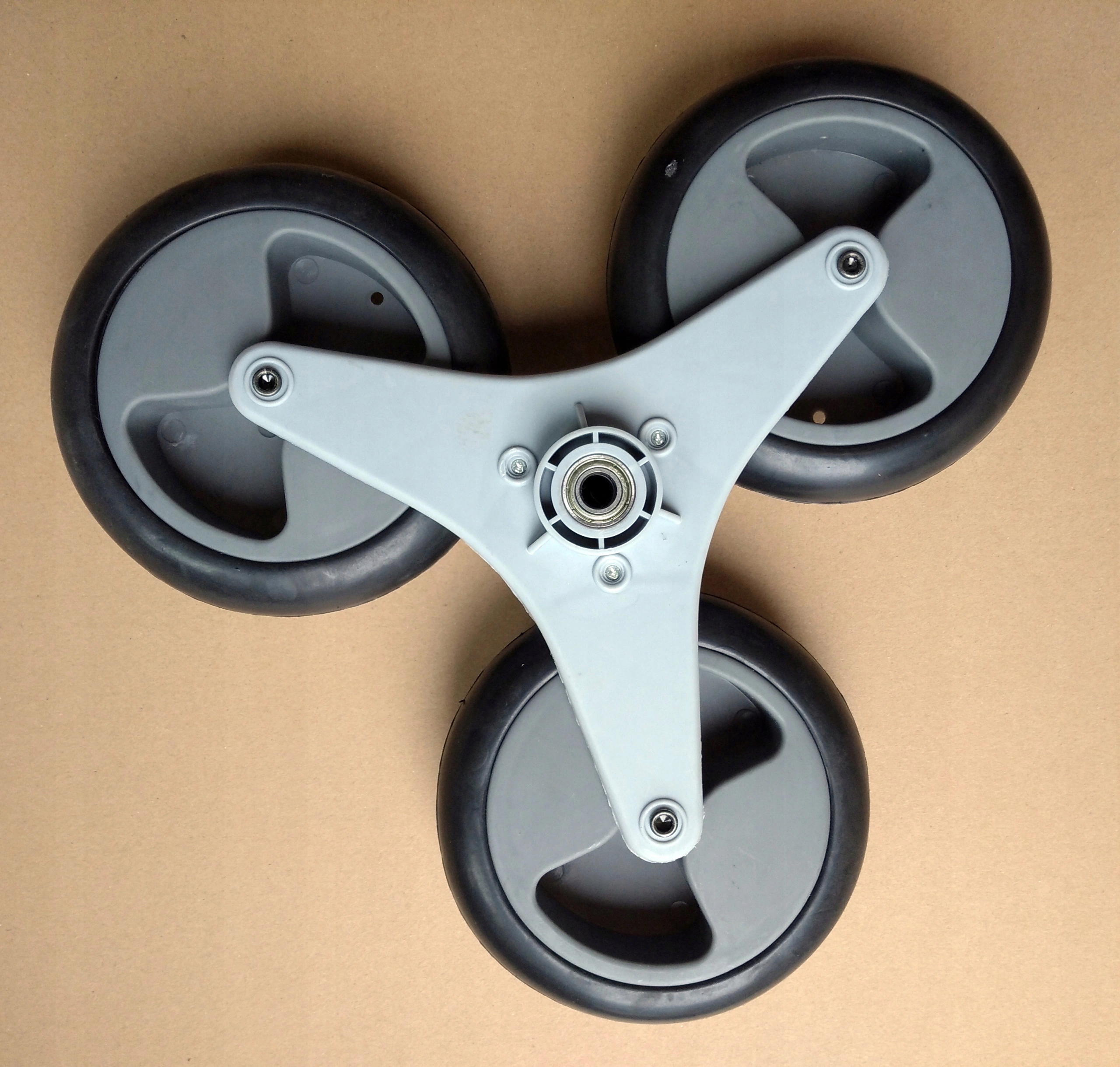 Коляска имеет тройную систему колес, которая облегчает преодоление лестниц и бордюров. Шина изготовлена из легкой и устойчивой к истиранию пены EVA. Колеса также можно снять, чтобы уменьшить размер, например, для перевозки в автомобиле.