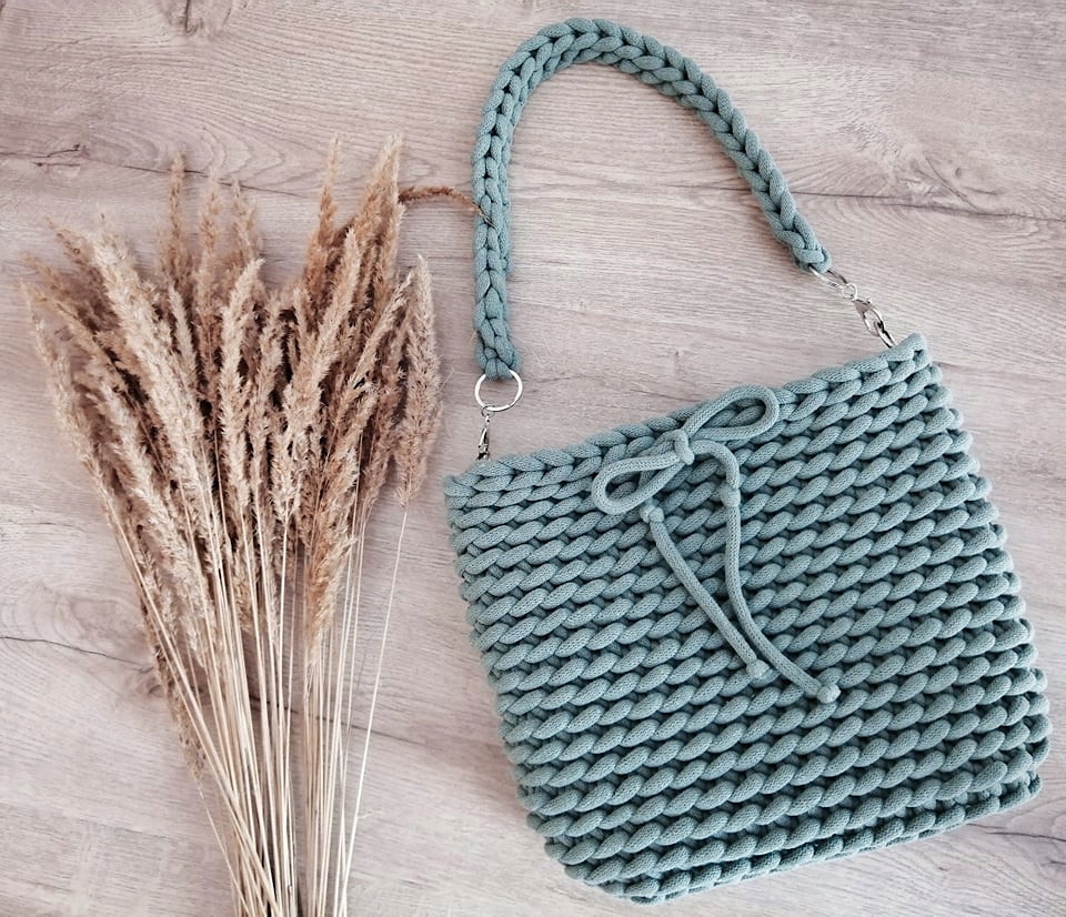 Сумка на коротком съемном плечевом ремне или для ручной переноски, полностью ручная работа, связана крючком из 100% веревки толщиной 9 мм.