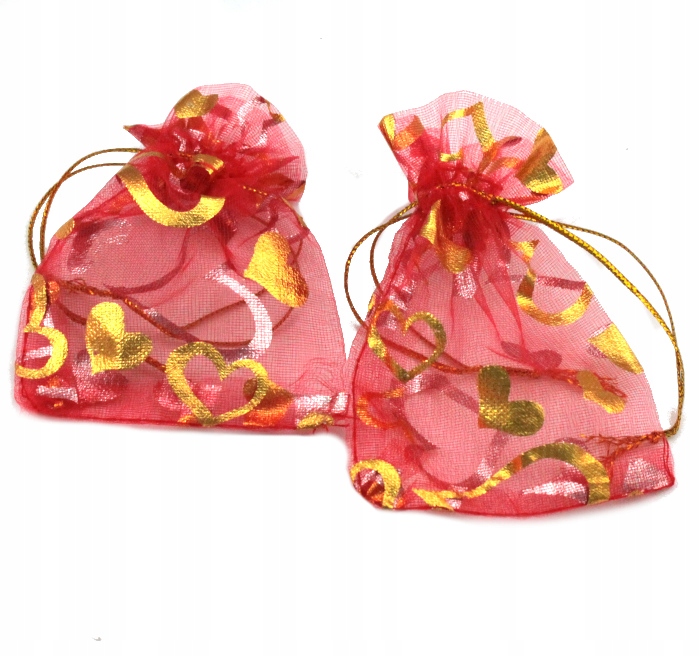 СУМКИ З ЧЕРВОНОЇ ОРГАНЗИ 2 ШТ. ЗОЛОТІ СЕРЦЯ 7 Х 9 СМ