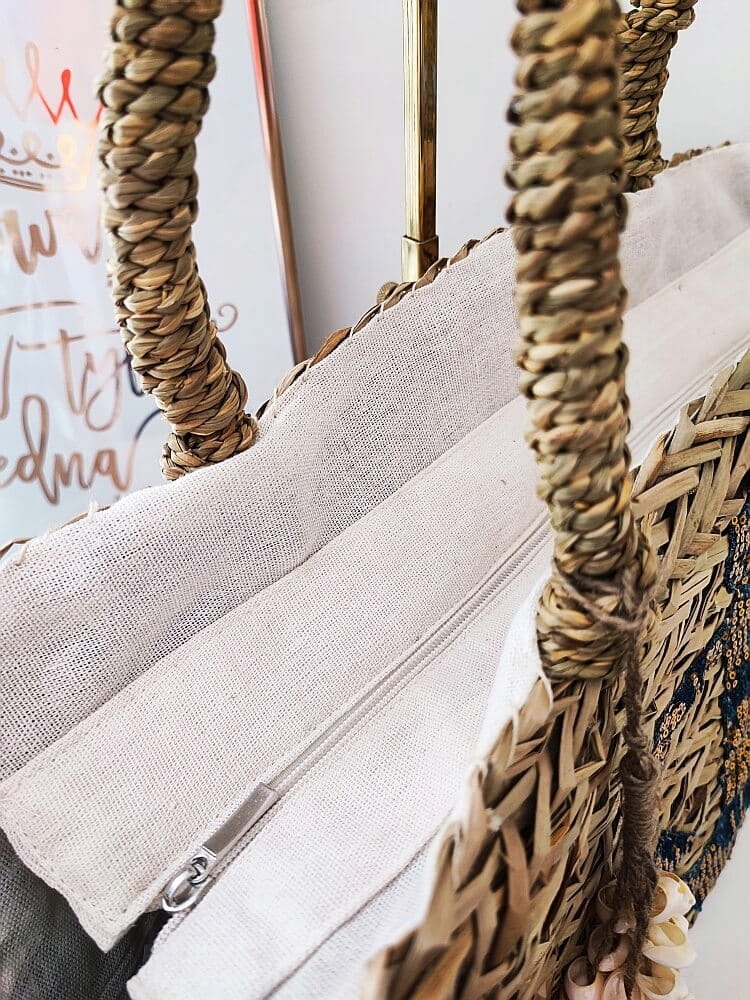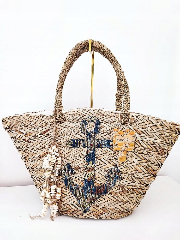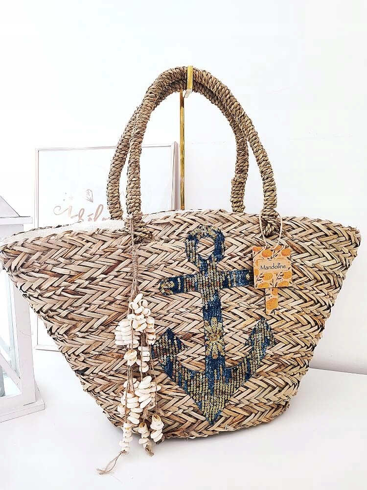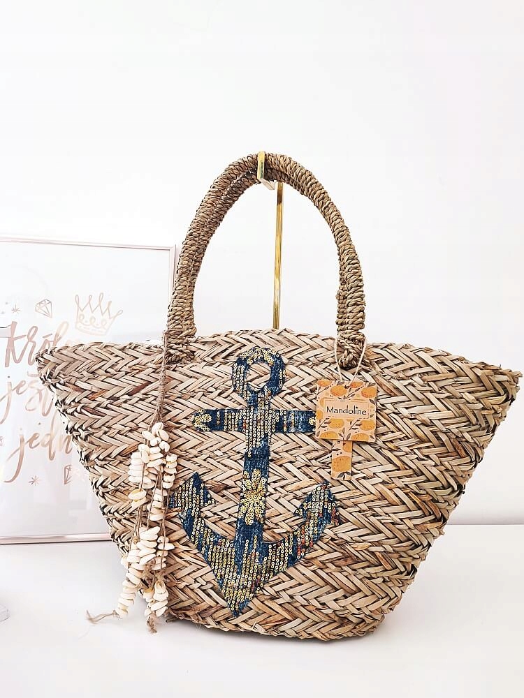 На передней корзине декоративное нанесение блесток и джинсов и съемное кольцо с ключами с раковинами.