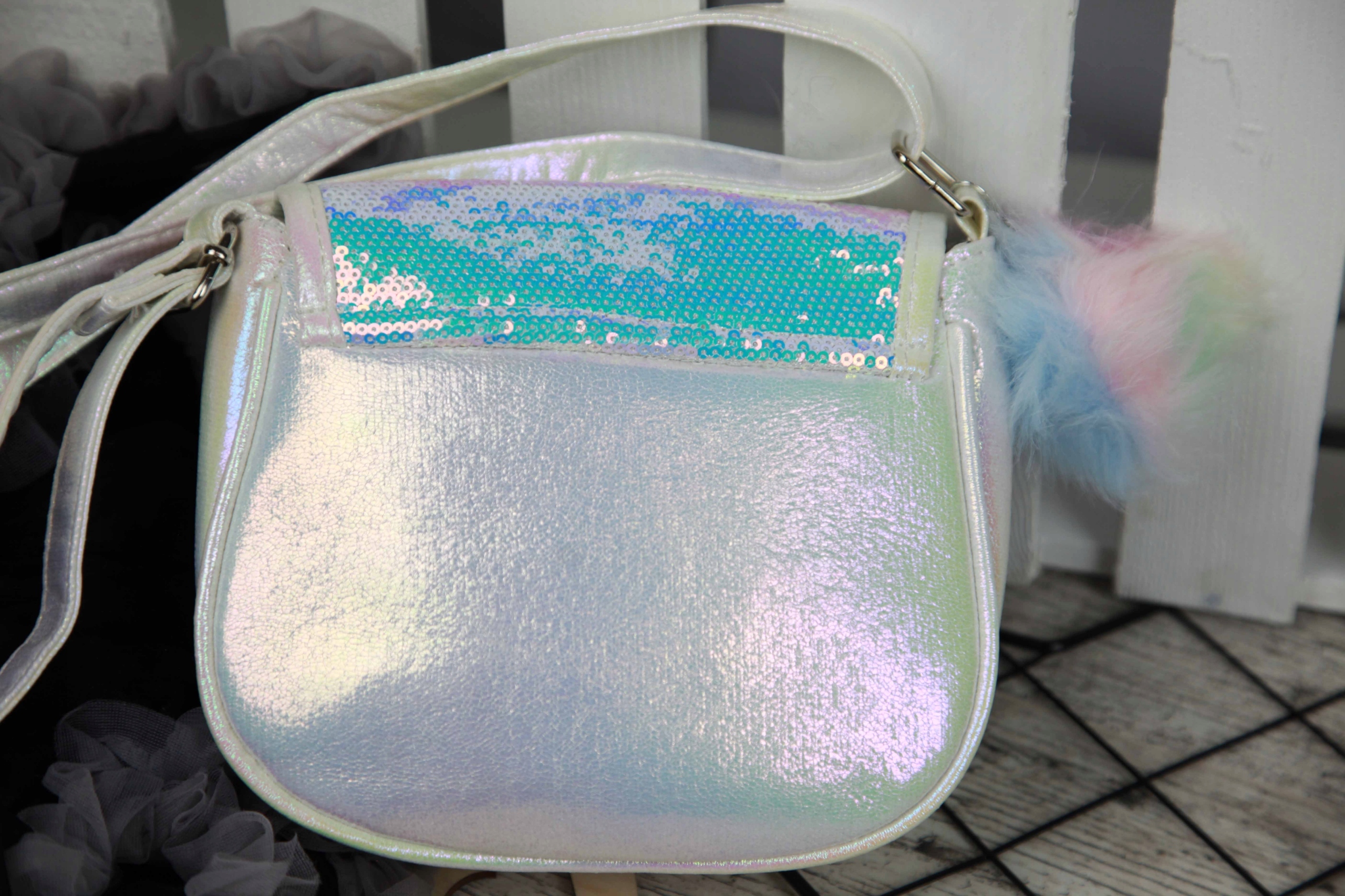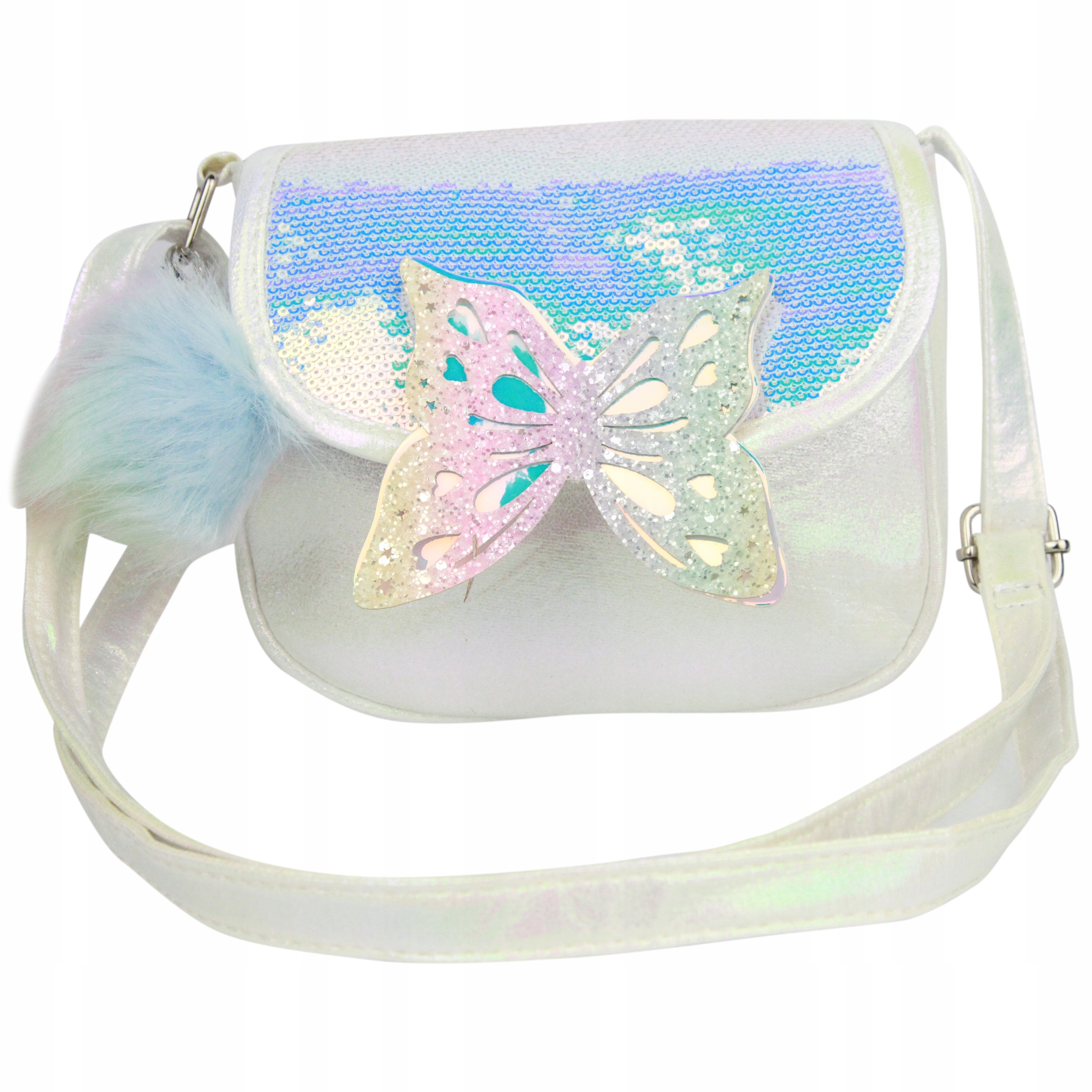 Клапан сумки расшит красиво сверкающими пайетками. Дополнительно очарования добавляет удивительная бабочка, крылья которой покрыты блестящими частичками. Кроме того, к сумке прилагается брелок с баночками пастельных тонов.