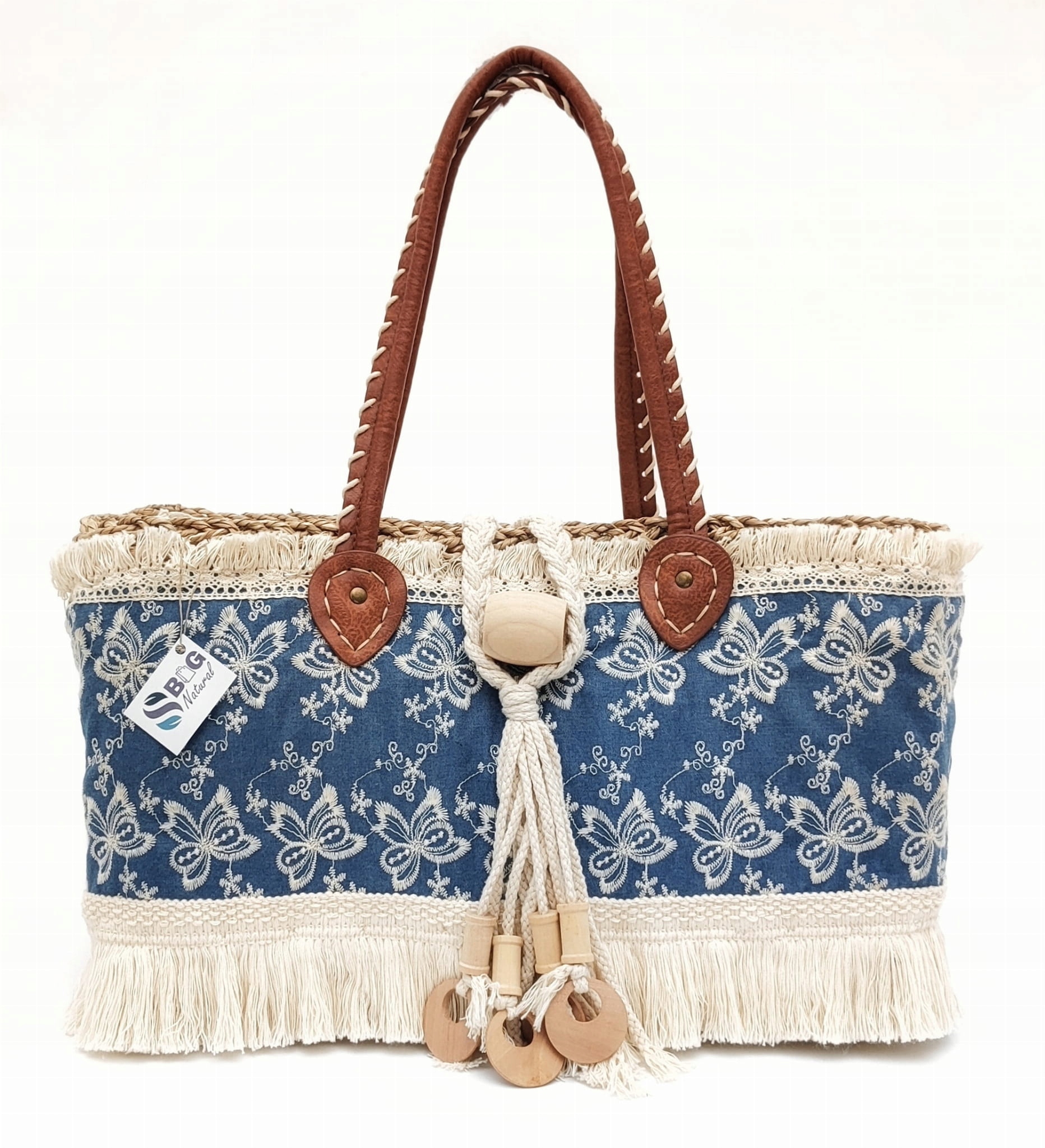- украшенные вышитыми джинсами, полосами и хлопковым кисточником с деревянными элементами