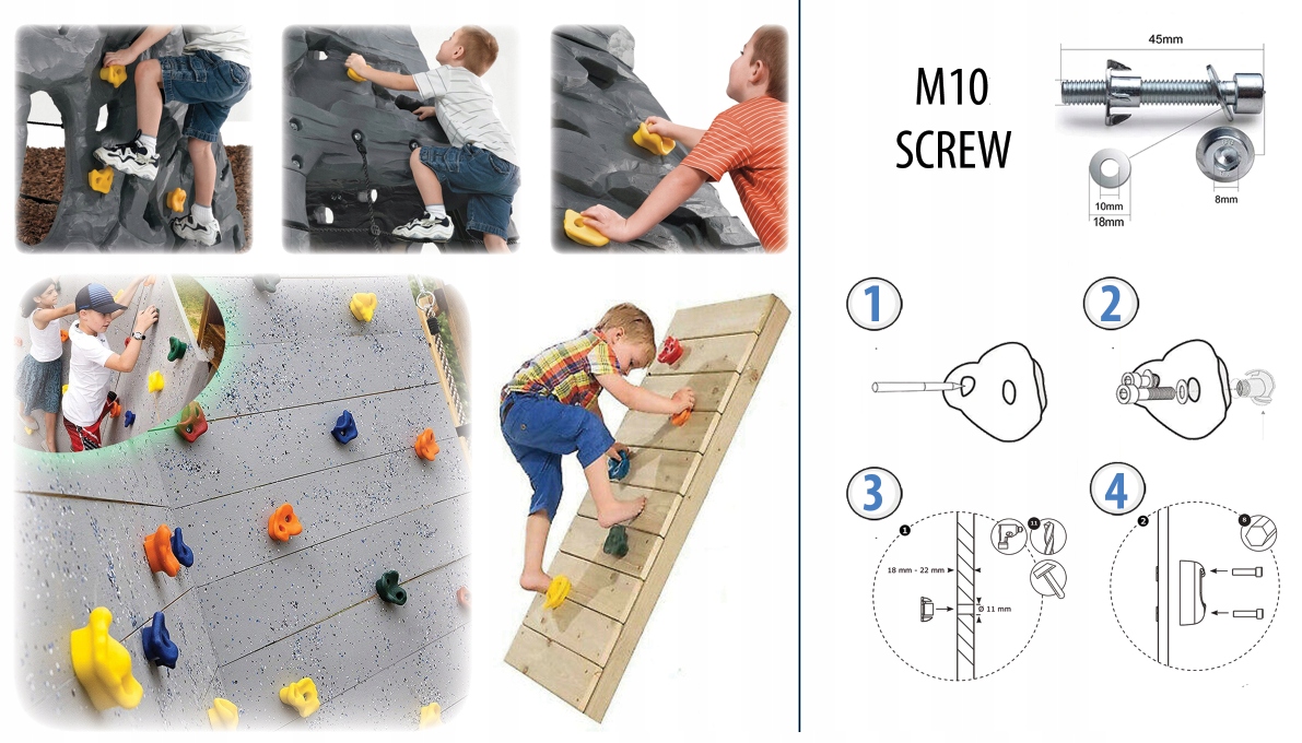 В комплект входят 5 пластиковых элементов для лазания, крепящихся винтами М10.