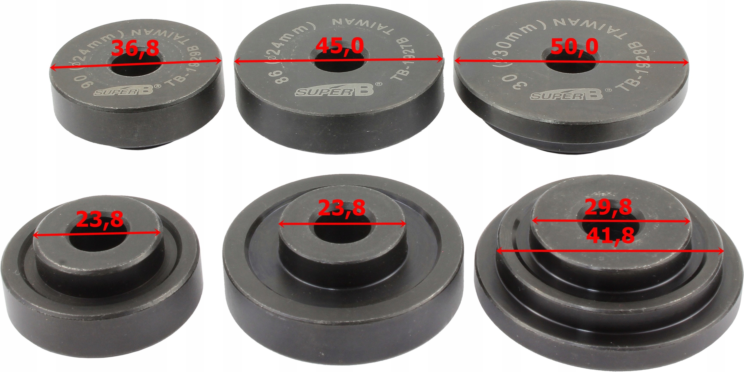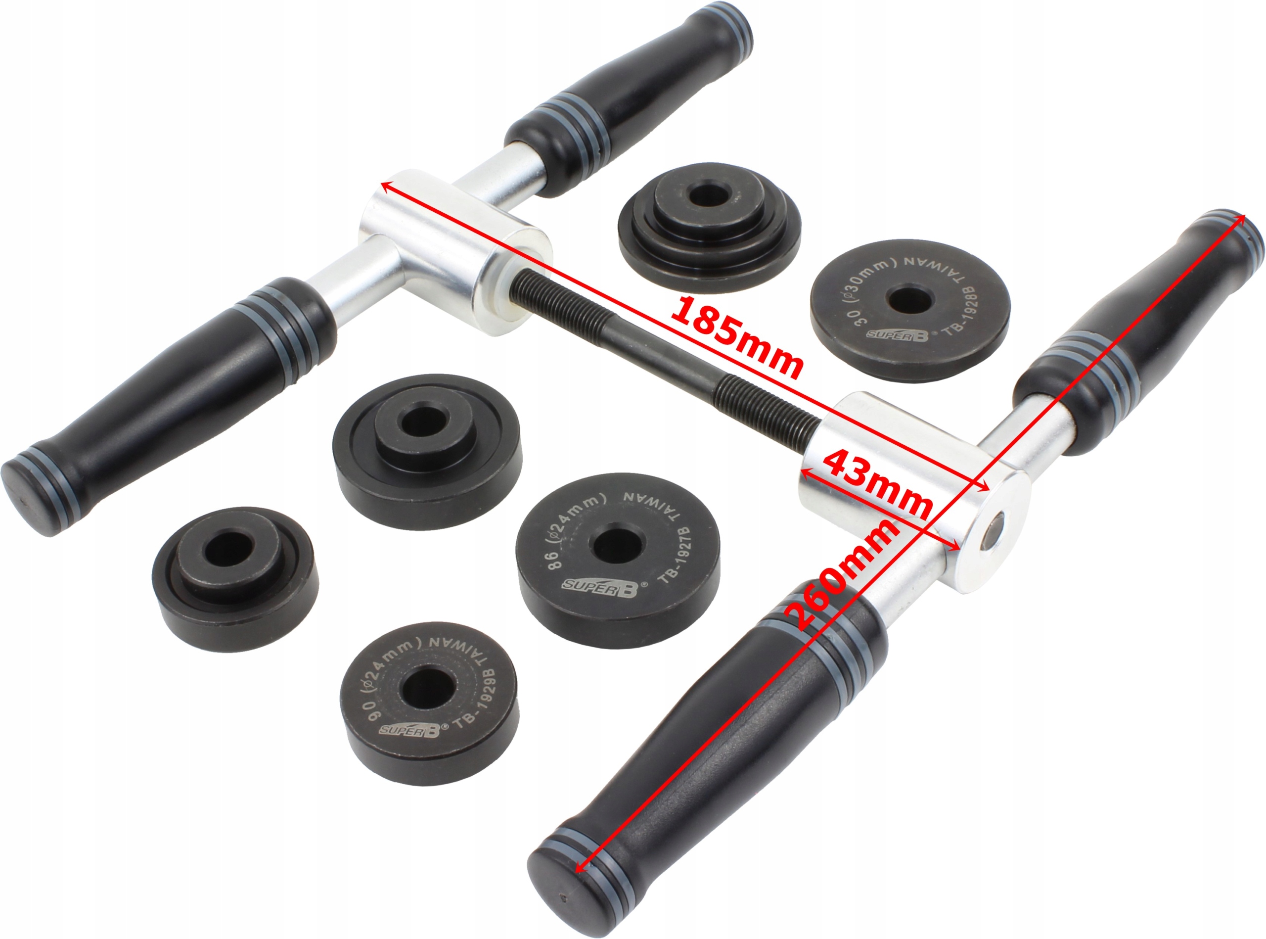 TB-1900B — ПОЛНЫЙ КОМПЛЕКТ ОТ ТАЙВАНСКОГО БРЕНДА SUPER B ДЛЯ ЛЕГКОЙ И ТОЧНОЙ УСТАНОВКИ ПОДШИПНИКОВ КРОНШТЕЙНА САМЫХ ПОПУЛЯРНЫХ НА СЕГОДНЯ СТАНДАРТОВ: PressFit BB86/91, BB90/95, PressFit PF30 И BB30. ИДЕАЛЬНО ДЛЯ SHIMANO PRESS FIT, SRAM PF30, TREK BB90 И ПОХОЖИХ КРОНШТЕЙНОВ. ИНСТРУМЕНТ, ИЗГОТОВЛЕННЫЙ ВЫСОКОЙ ТОЧНОСТИ, ОБОРУДОВАННЫЙ ОСЬЮ 185 мм И РУЧКАМИ 260 мм. СДЕЛАН ИЗ СТАЛИ И ЧАСТИ АЛЮМИНИЯ. ТЕФЛОНОВЫЕ НАКЛАДКИ СНИЖАЮТ ТРЕНИЕ, ЧТО ОБЕСПЕЧИВАЕТ РАБОТУ ИНСТРУМЕНТА ПЛАВНО.РУЧКИ ПОКРЫТЫ ПЛАСТИКОМ.ИНСТРУМЕНТ ПОЛНОСТЬЮ РАЗБОРКА, ПОЭТОМУ ЕГО МОЖНО ЛЕГКО ХРАНИТЬ, КОГДА ЕГО НЕ ИСПОЛЬЗУЮТ.