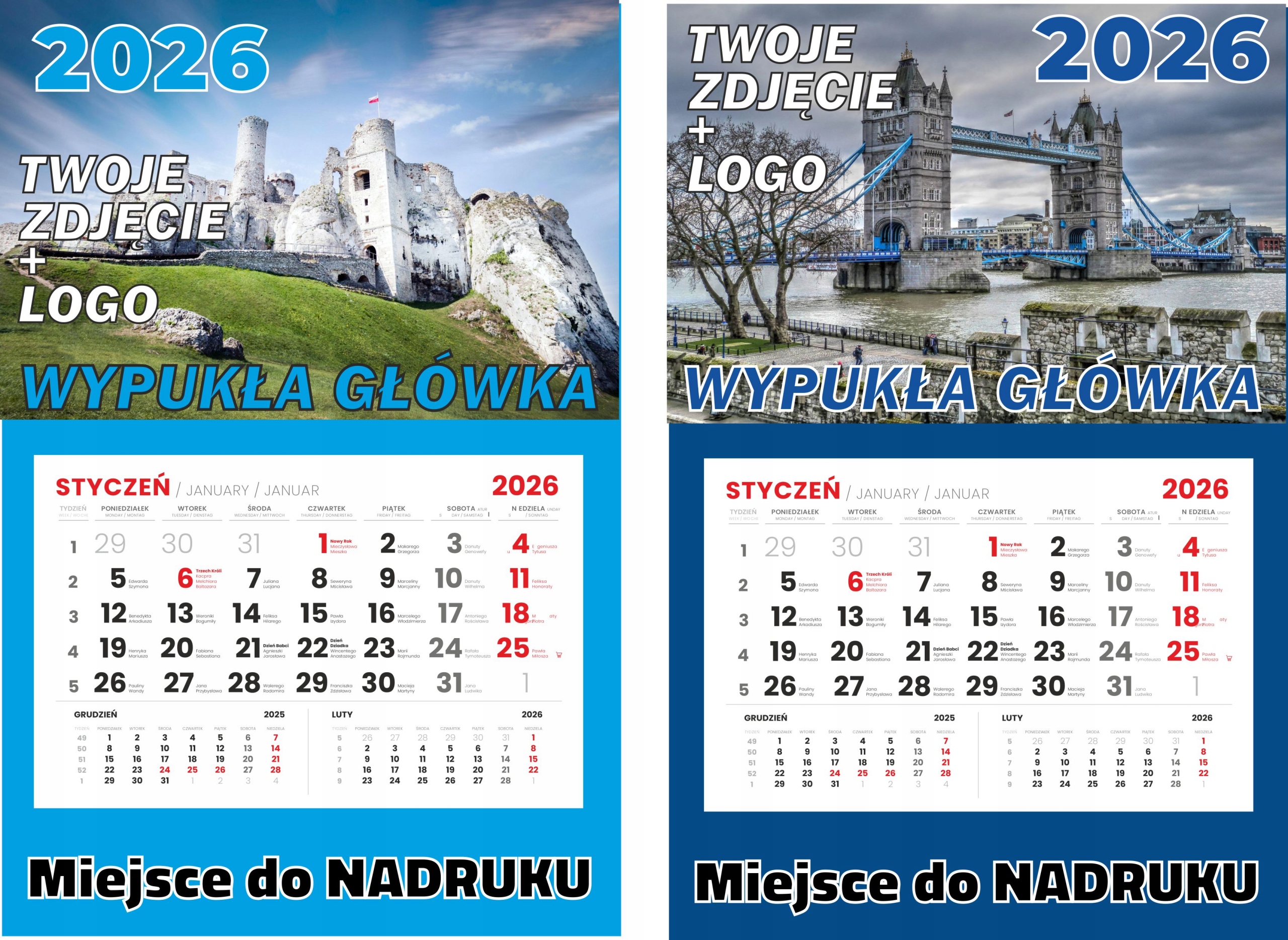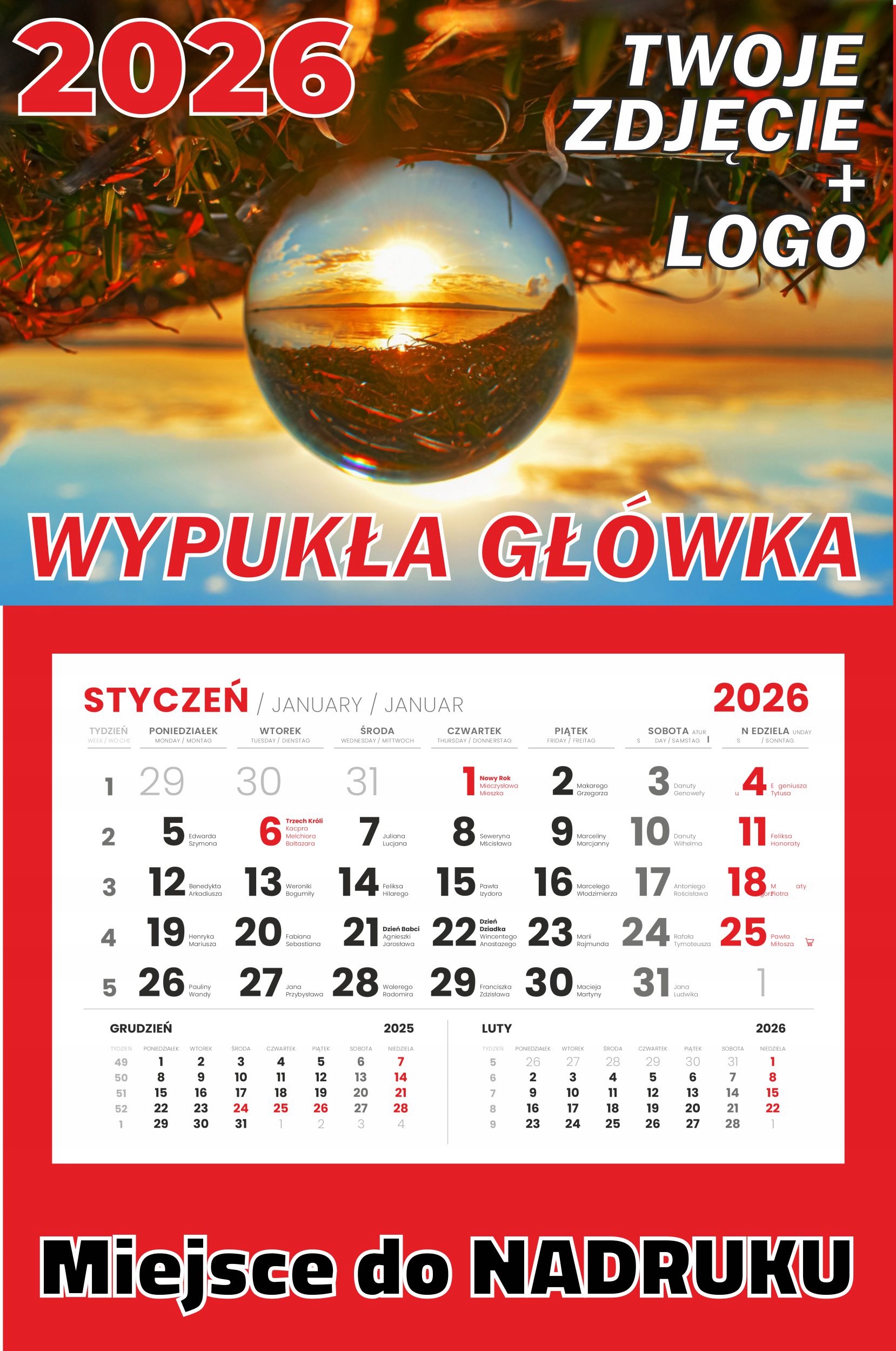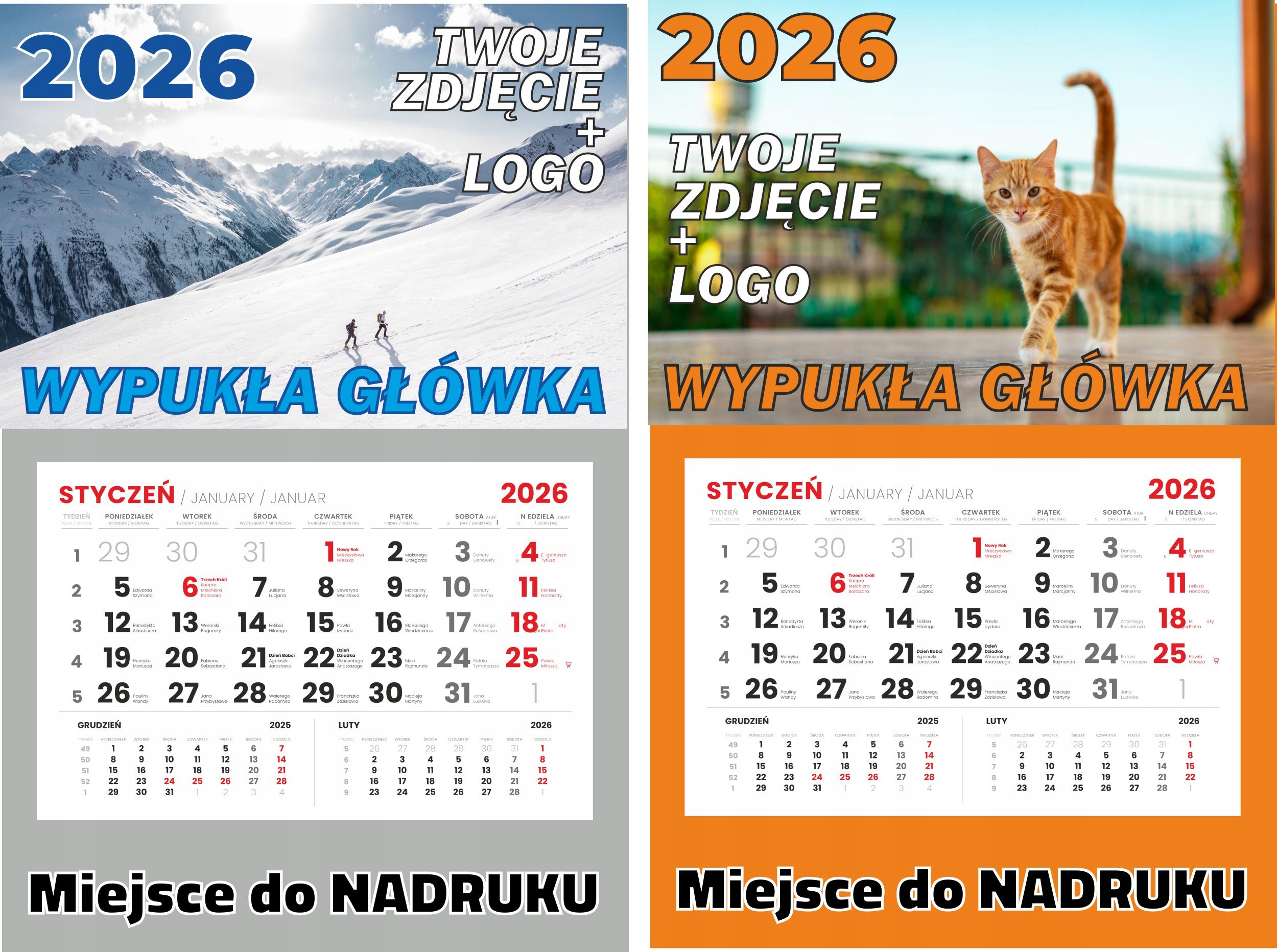 Голова календаря напечатана в полном цвете , что позволяет создавать любой графический дизайн, размещение персонажей компании, фотографий, текстов в любых цветах. Подложка, используемая для печати, представляет собой специальную картон с весом 300 г, гарантируя очень хорошее качество цвета . Добавление используемой флэш -фольги явно оживляет цвет и в то же время увеличивает долговечность календаря. В верхней части головы есть отверстие, которое позволяет вам приостановить календарь. Верхний край календаря дополнительно потерян и приклеен, что укрепляет его жесткость. В середине календаря, над календарем, большая линия работает, благодаря которой легко сложить пополам.