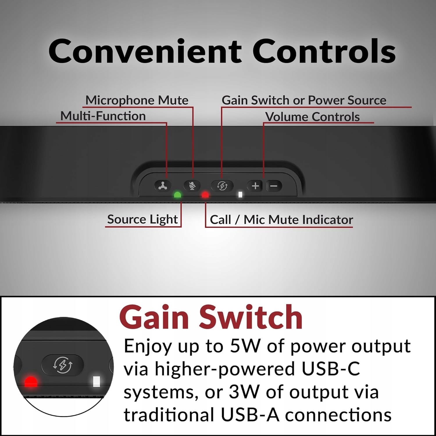 Cyber Acoustics CA-2890PRO Speaker предлагает соединение USB и Bluetooth 5.0, что позволяет подключаться к компьютеру или смартфону. Прикрепленный для мониторов до 2 дюймов, он имеет легко доступные кнопки для переключения источников звука, регулировки громкости и успокоения микрофона. Задний басовый радиатор обеспечивает глубокий бас, а технология умного голоса минимизирует фоновый шум во время разговоров.