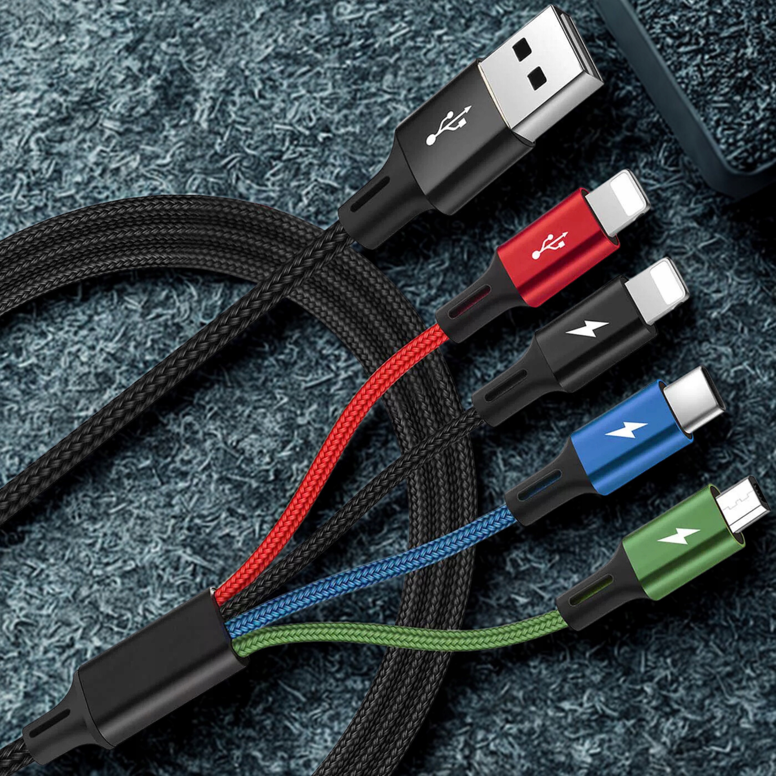 Вы сыты на горло клубок проводов? Этот мультифункциональный 4IN1 кабель - отличное решение для людей, которые используют разные устройства - как с Android, так и с iOS. Благодаря четырем различным советам, вы можете одновременно загрузить несколько устройств и Отправить данные - быстро, удобно и без хаоса.