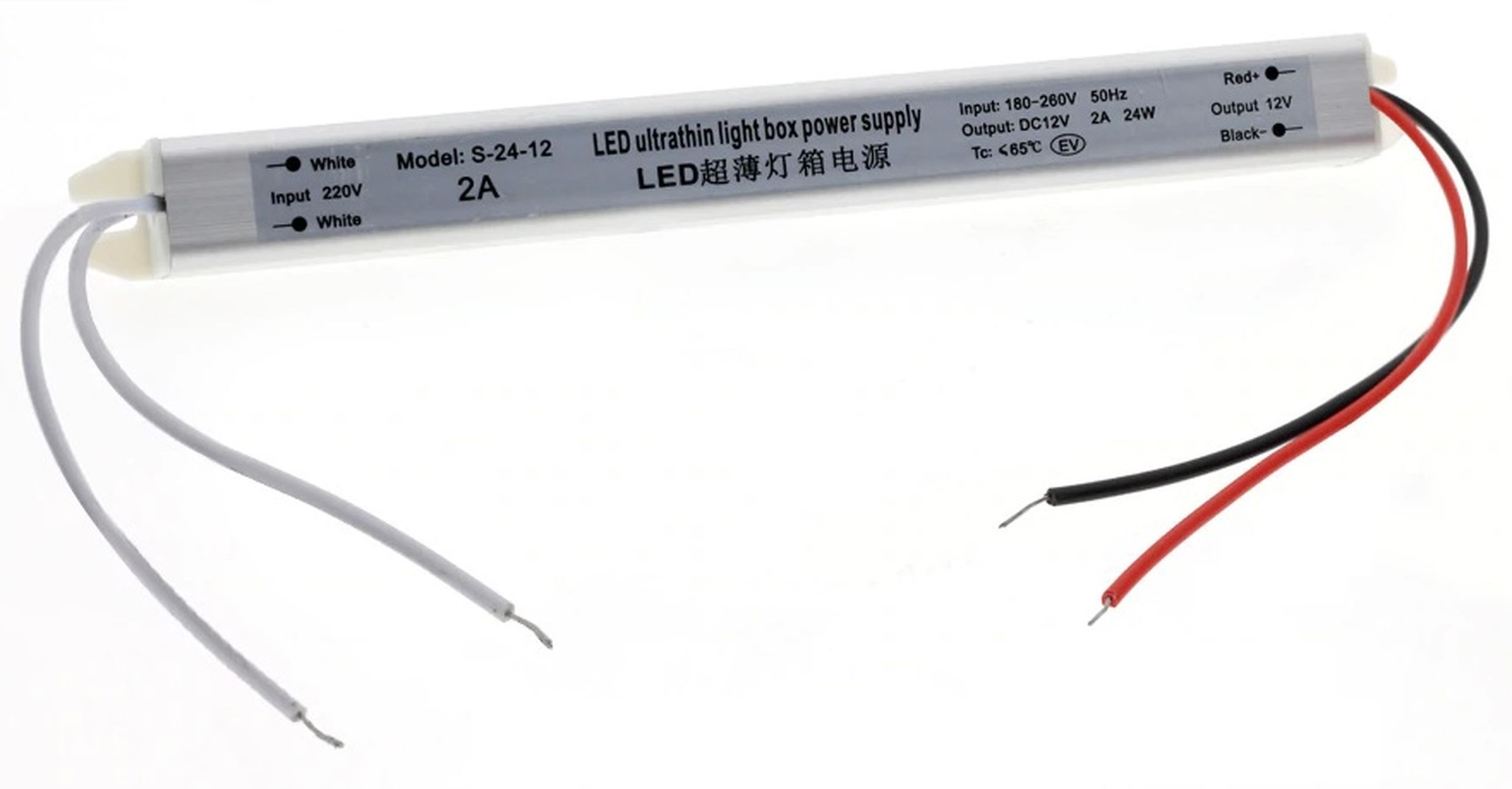 Импульс 2A источник питания - стабилизированное напряжение, идеально подходит для питания лент, светодиодных модулей, луковиц и других устройств, требующих 12 В. Тонкий источник питания, как и на фотографии, подключается к зажимам винтов. В металлическом и пластиковом корпусе