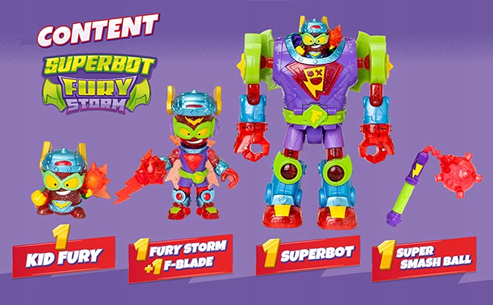 Super Things — это серия коллекционных игрушек, посвященных персонажам с характерной супергеройской или злобной внешностью. Это небольшие фигурки и игрушки, которые побуждают собирать, обмениваться и создавать различные сценарии. Робот Superbot Fury Storm Super Things — изделие, сочетающее в себе элементы большого робота с более мелкими персонажами из серии «Супер Вещи».