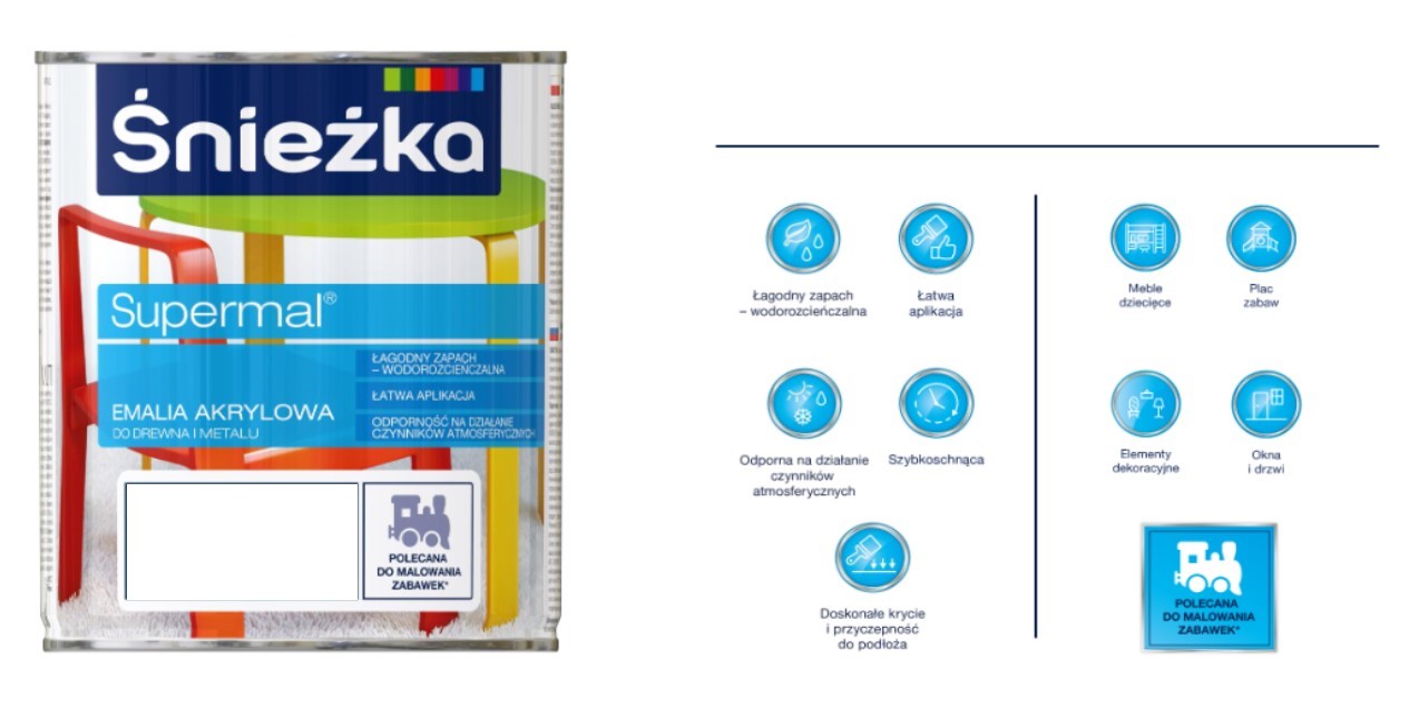 Акриловая эмаль СУПЕРМАЛ®предназначена для декоративной и защитной окраски древесины, древесных материалов, штукатурки. а также стальные и чугунные элементы, используемые внутри и снаружи помещений, наружные помещения, такие как: двери, окна, мебель и т. д.