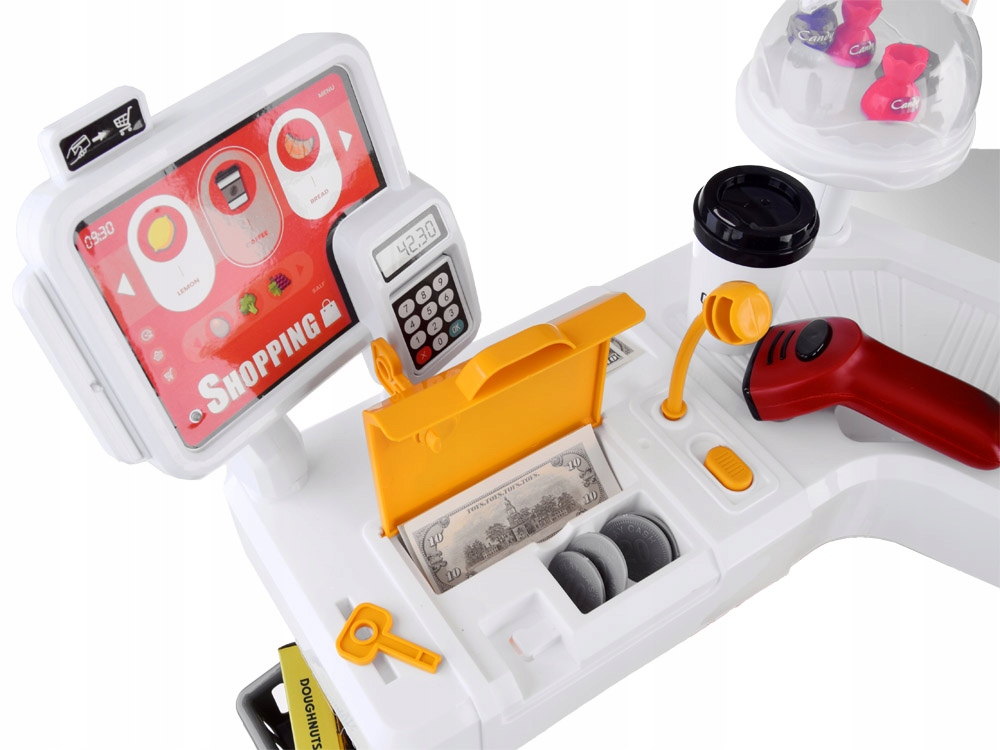 - В набор входит: - супермаркет - тележка для покупок - 2 круассана - хлеб - морковь - апельсин - красный перец - зеленый перец - виноград - банан - 2 яйца - лимон - шоколад - 3 конфеты - 2 маленькие кофейные чашки - большая кофейная чашка - 2 сахара - 2 чашки мороженого - йогурт - 2 бутылки с напитком - банка для напитка - банка с вареньем - бутылка с мерным стаканчиком - 9 картонных коробок, имитирующих продукт - карточка - телефон - 6 монет - 15 банкнот - считыватель - 2 ключа