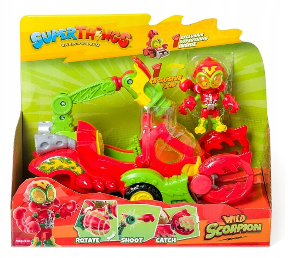 SuperThings WILD SCORPION Сражайтесь на земле или в воздухе на автомобиле Wild Skorpion против своего противника Wild Eagle! С мощными атаками животных и умелыми пилотами начинается самая дикая дуэль! Откройте для себя всю мощь Скорпиона с эксклюзивными Wild Kid и SuperThing, занимающими свое место в кабине. У Дикого Скорпиона есть когти для ловли соперников, которые вращаются при движении. Кроме того, он может стрелять по героям своим мощным жалом!