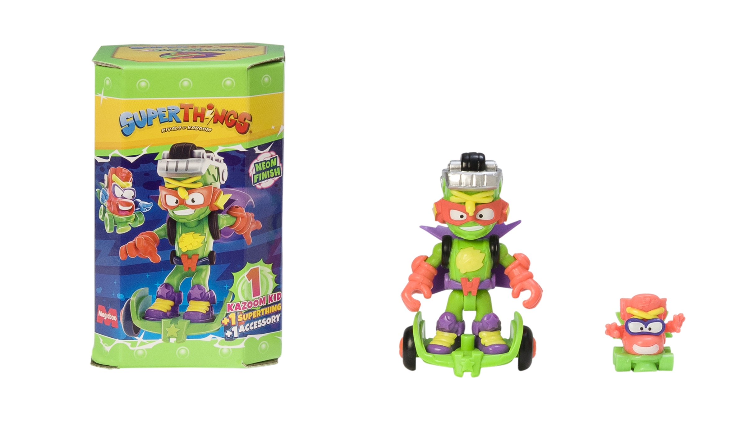 - НЕОНОВЫЕ КОЛЛЕКЦИОННЫЕ ФИГУРКИ — ColorFlash, ультра-редкая фигурка из серии, бывший мастер Enigma и обладает супер-неоновыми способностями! Именно поэтому в Kaboom City появилось 6 новых Kazoom Kids, теперь с неоновым эффектом! Cool Corn, Fizzy, Singstar, Freestyle, Rollerbolt и Slipp. Соберите их все!