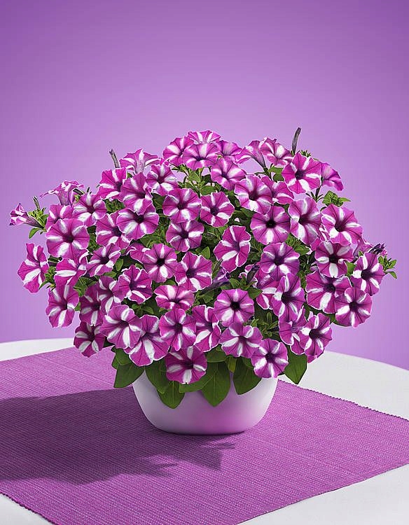 Supertunia Vista Это имя характеризуется группой разновидностей Petunia, которые производят нежные побеги