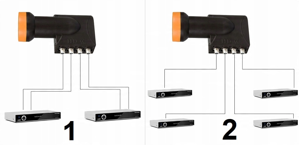 Конвертер работает с декодерами всех цифровых платформ, доступных на польском рынке, включая Polsat Cyfrowy, NC+, предоплаченное телевидение. Конвертер обеспечивает независимый прием сигнала с одного спутника. на 4 тюнера или 2 двухголовых ПВР (рекордера). Работает с любым спутниковым тюнером, как SD, так и HD 4k.