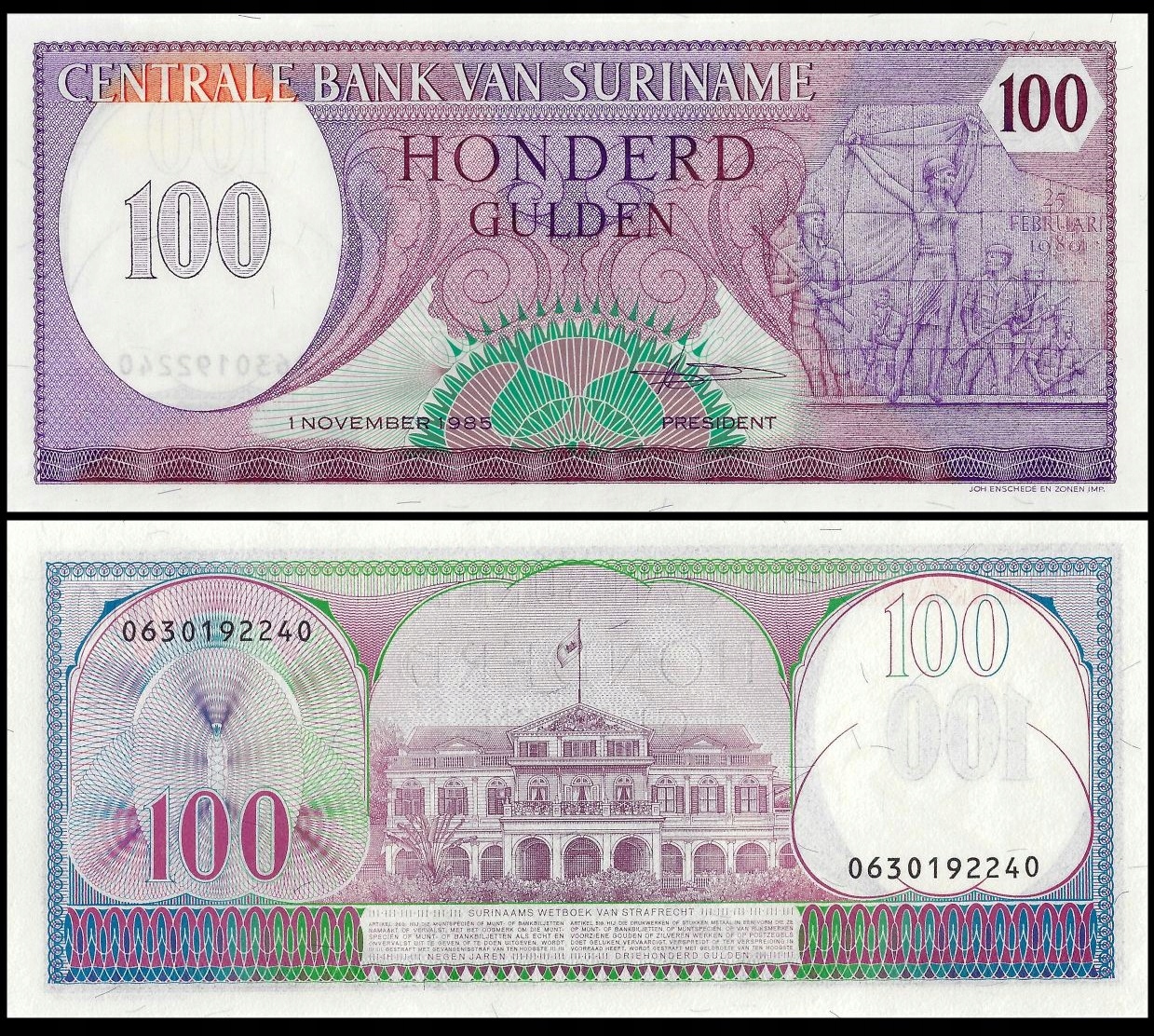 Суринам 100 Gulden 1985 P-128b UNC