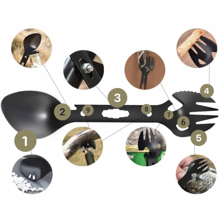 Многофункциональный инструмент, который будет полезен при приеме полевых обедов. Изготовлен из прочного металла с антикоррозионными свойствами.